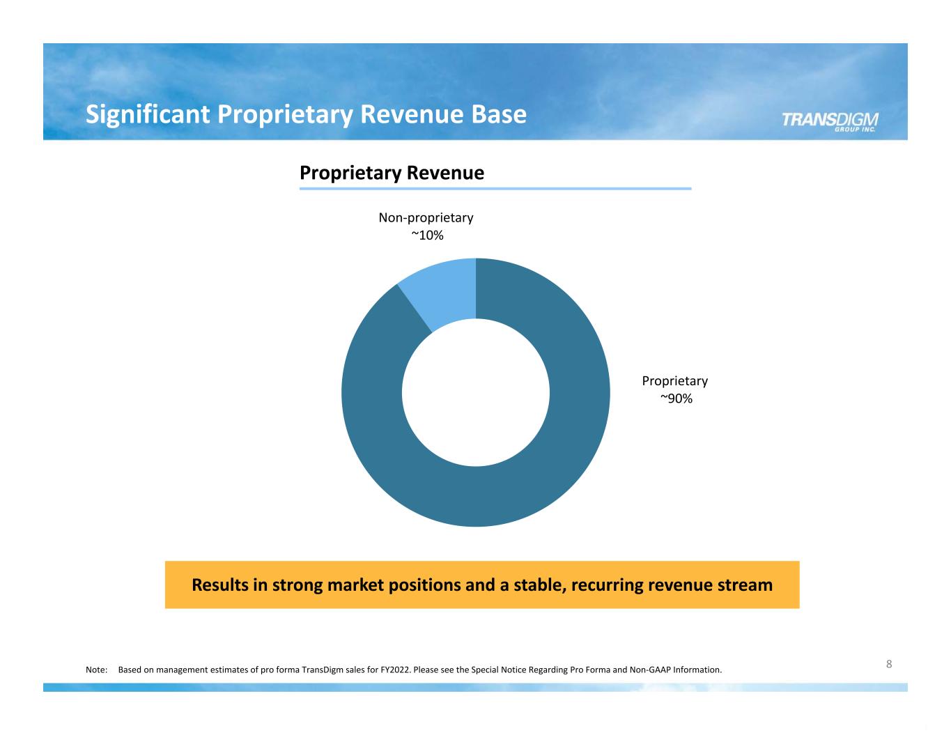 Note: Based on management estimates of pro forma TransDigm sales for FY2022. Please see the Special Notice Regarding Pro Forma and Non‐GAAP Information. 8 Proprietary Revenue Proprietary ~90% Non‐proprietary ~10% Results in strong market positions and a stable, recurring revenue stream Significant Proprietary Revenue Base