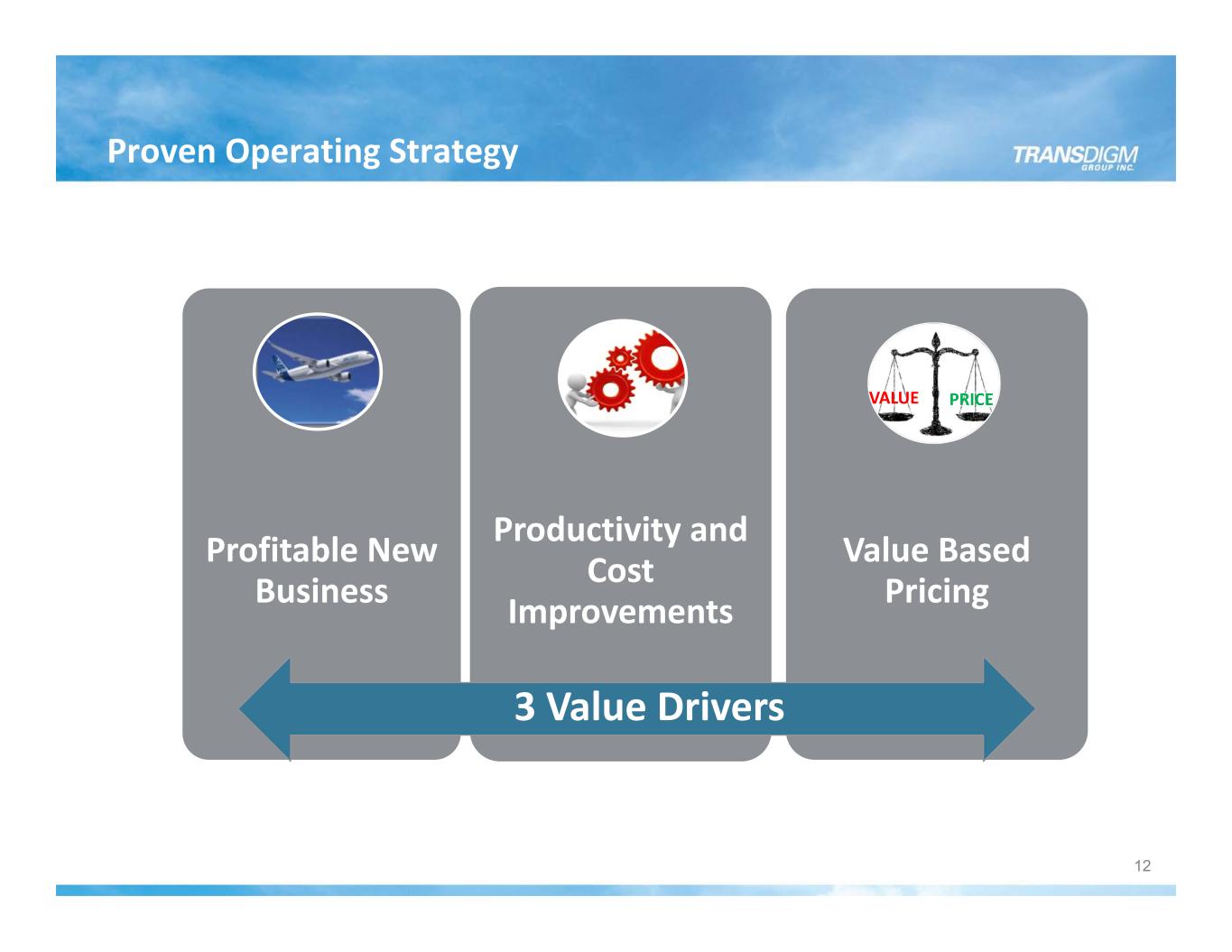 12 Proven Operating Strategy Profitable New Business Productivity and Cost Improvements Value Based Pricing 3 Value Drivers VALUE PRICE