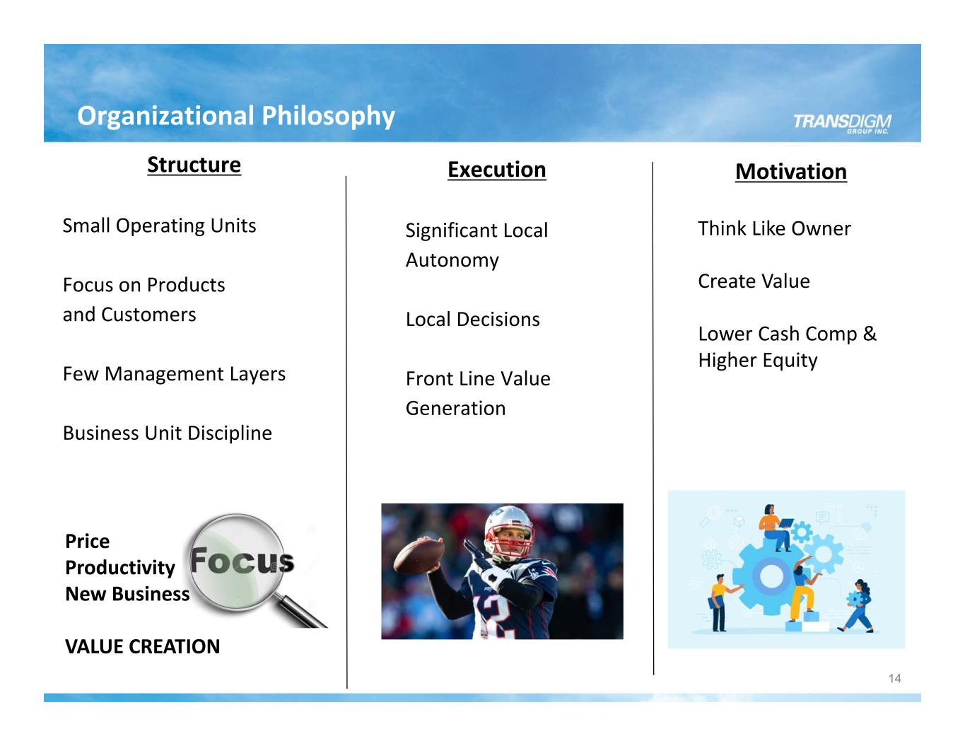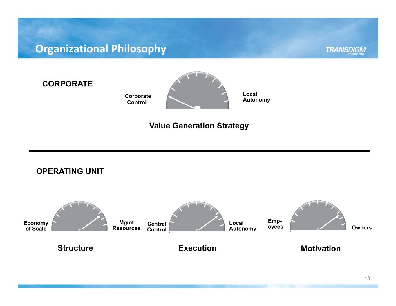Corporate Control Local Autonomy Economy of Scale Mgmt Resources Value Generation Strategy Structure Execution Motivation Central Control Local Autonomy Emp- loyees Owners CORPORATE OPERATING UNIT Organizational Philosophy 13