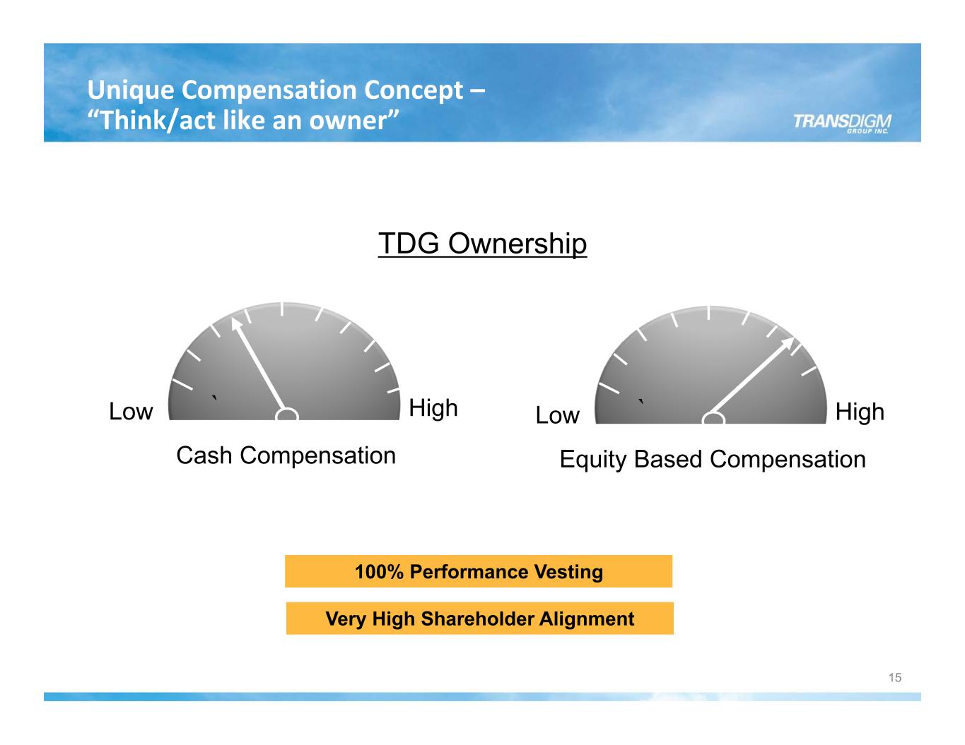 Unique Compensation Concept – “Think/act like an owner” Low ` High Cash Compensation 100% Performance Vesting TDG Ownership Low ` High Equity Based Compensation Very High Shareholder Alignment 15