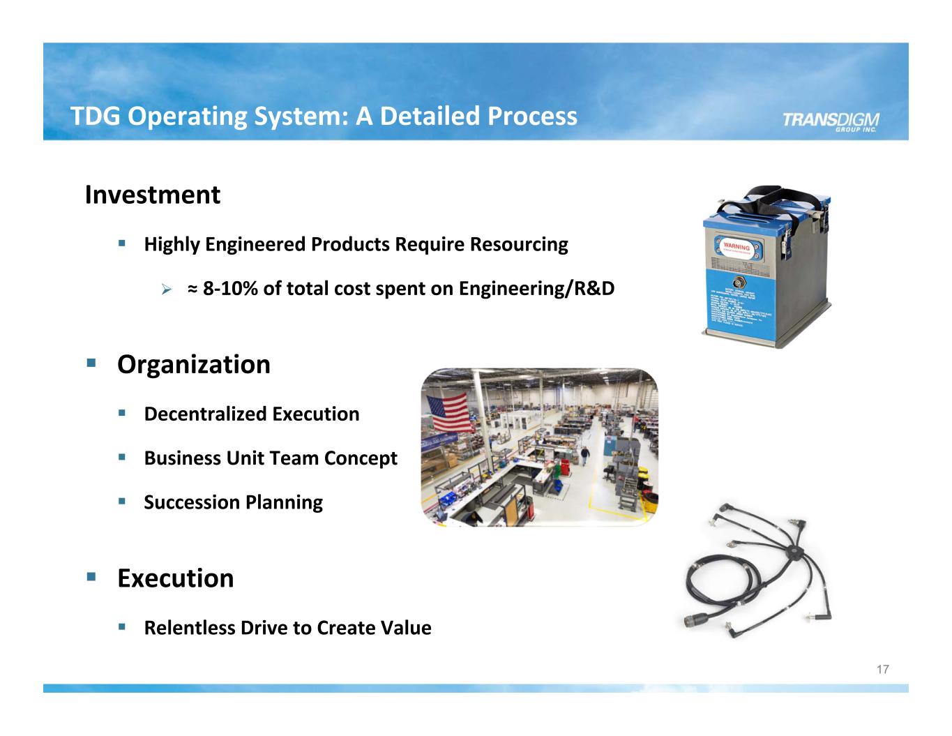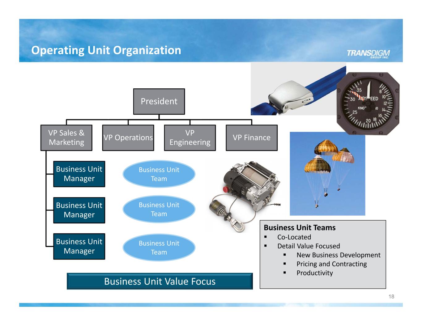 TDG Operating System: A Detailed Process Investment Highly Engineered Products Require Resourcing ≈ 8‐10% of total cost spent on Engineering/R&D Organization Decentralized Execution Business Unit Team Concept Succession Planning Execution Relentless Drive to Create Value 17