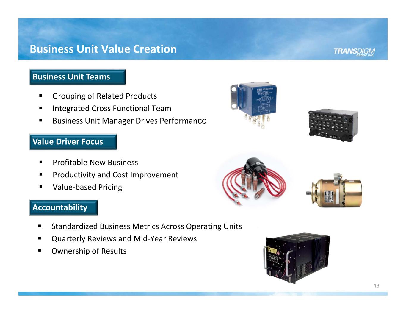 President VP Sales & Marketing Business Unit Manager Business Unit Manager Business Unit Manager VP Operations VP Engineering VP Finance Operating Unit Organization Business Unit Team Business Unit Team Business Unit Team Business Unit Value Focus Business Unit Teams Co‐Located Detail Value Focused New Business Development Pricing and Contracting Productivity 18