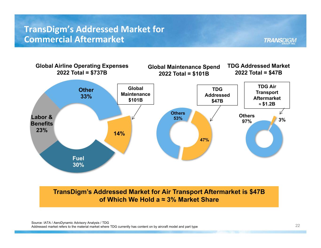 14% Fuel 30% Labor & Benefits 23% Other 33% Global Maintenance $101B TransDigm’s Addressed Market for Commercial Aftermarket Global Airline Operating Expenses 2022 Total = $737B Source: IATA / AeroDynamic Advisory Analysis / TDG Addressed market refers to the material market where TDG currently has content on by aircraft model and part type Global Maintenance Spend 2022 Total = $101B 47% Others 53% TDG Addressed $47B TDG Addressed Market 2022 Total = $47B 3% Others 97% TDG Air Transport Aftermarket ≈ $1.2B TransDigm’s Addressed Market for Air Transport Aftermarket is $47B of Which We Hold a ≈ 3% Market Share 22