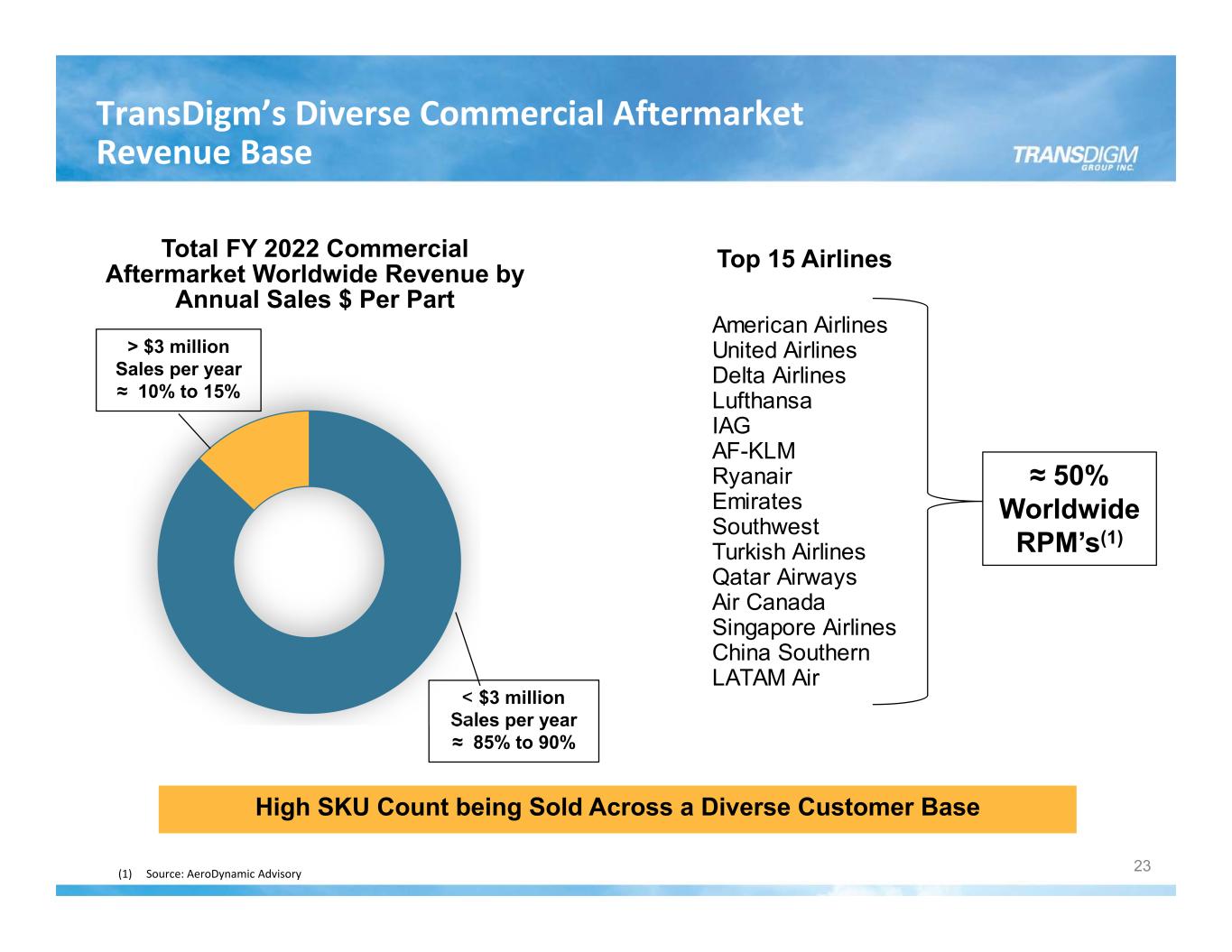 < $3 million Sales per year ≈ 85% to 90% TransDigm’s Diverse Commercial Aftermarket Revenue Base Total FY 2022 Commercial Aftermarket Worldwide Revenue by Annual Sales $ Per Part American Airlines United Airlines Delta Airlines Lufthansa IAG AF-KLM Ryanair Emirates Southwest Turkish Airlines Qatar Airways Air Canada Singapore Airlines China Southern LATAM Air ≈ 50% Worldwide RPM’s(1) Top 15 Airlines 23 > $3 million Sales per year ≈ 10% to 15% High SKU Count being Sold Across a Diverse Customer Base (1) Source: AeroDynamic Advisory