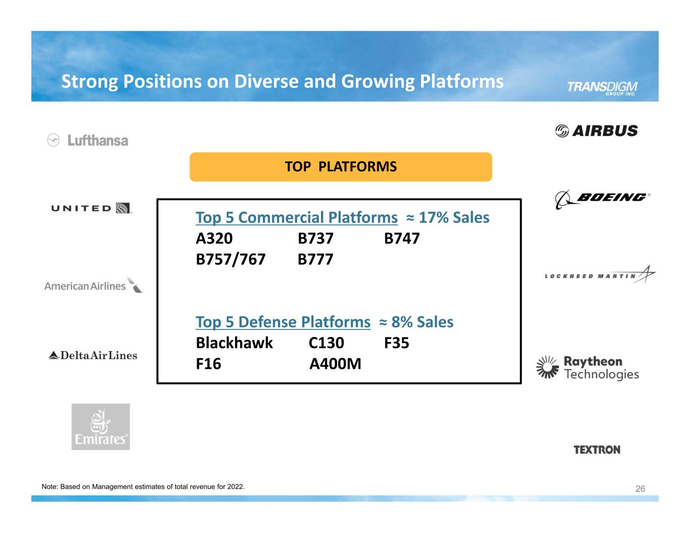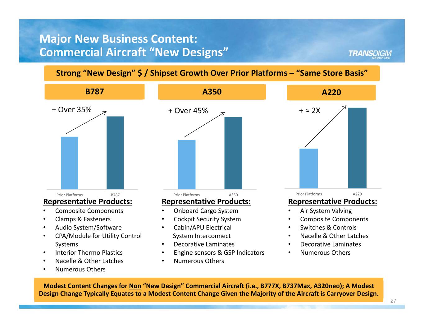 Strong Positions on Diverse and Growing Platforms Note: Based on Management estimates of total revenue for 2022. Top 5 Commercial Platforms ≈ 17% Sales A320 B737 B747 B757/767 B777 Top 5 Defense Platforms ≈ 8% Sales Blackhawk C130 F35 F16 A400M TOP PLATFORMS 26