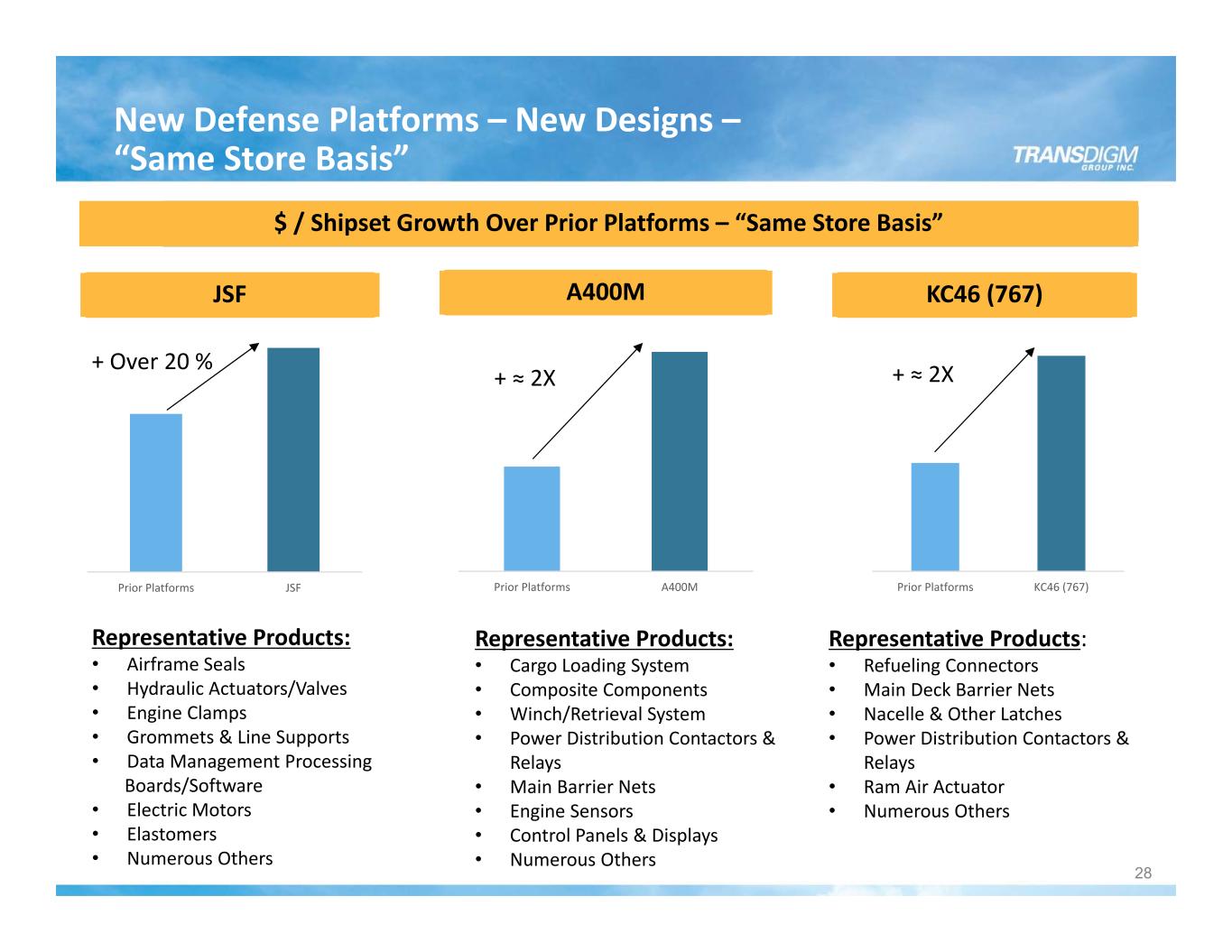 Prior Platforms A220Prior Platforms A350Prior Platforms B787 Major New Business Content: Commercial Aircraft “New Designs” 27 B787 A350 A220 Strong “New Design” $ / Shipset Growth Over Prior Platforms – “Same Store Basis” Representative Products: • Composite Components • Clamps & Fasteners • Audio System/Software • CPA/Module for Utility Control Systems • Interior Thermo Plastics • Nacelle & Other Latches • Numerous Others Representative Products: • Onboard Cargo System • Cockpit Security System • Cabin/APU Electrical System Interconnect • Decorative Laminates • Engine sensors & GSP Indicators • Numerous Others Representative Products: • Air System Valving • Composite Components • Switches & Controls • Nacelle & Other Latches • Decorative Laminates • Numerous Others + Over 35% + Over 45% + ≈ 2X 27 Modest Content Changes for Non “New Design” Commercial Aircraft (i.e., B777X, B737Max, A320neo); A Modest Design Change Typically Equates to a Modest Content Change Given the Majority of the Aircraft is Carryover Design.