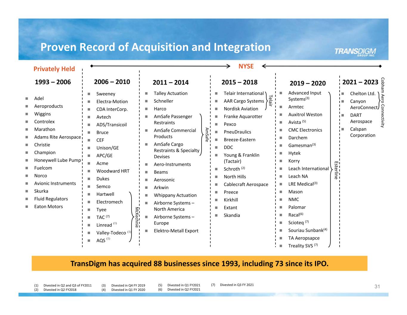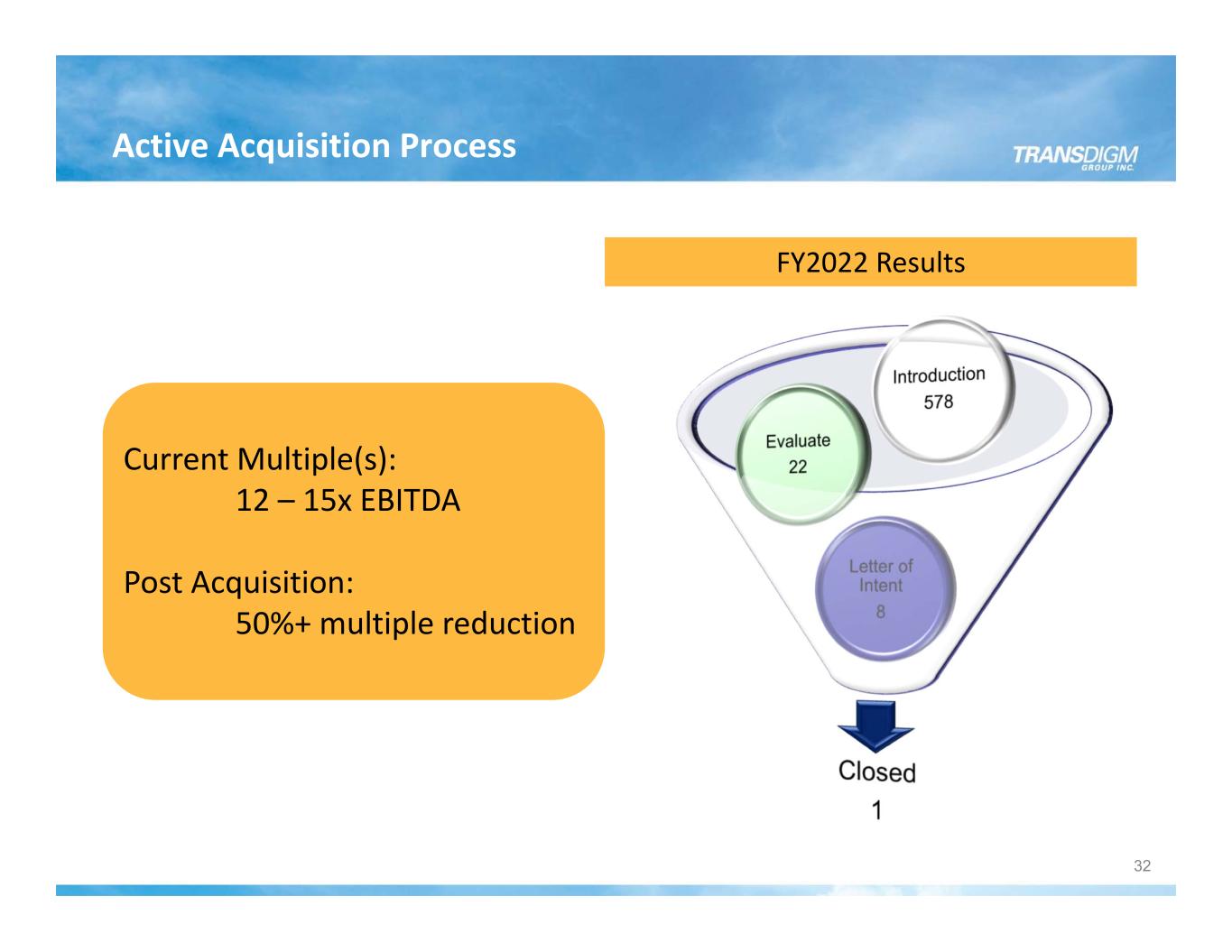 1993 – 2006 2006 – 2010 2011 – 2014 Adel Aeroproducts Wiggins Controlex Marathon Adams Rite Aerospace Christie Champion Honeywell Lube Pump Fuelcom Norco Avionic Instruments Skurka Fluid Regulators Eaton Motors Talley Actuation Schneller Harco AmSafe Passenger Restraints AmSafe Commercial Products AmSafe Cargo Restraints & Specialty Devises Aero‐Instruments Beams Aerosonic Arkwin Whippany Actuation Airborne Systems – North America Airborne Systems – Europe Elektro‐Metall Export Sweeney Electra‐Motion CDA InterCorp. Avtech ADS/Transicoil Bruce CEF Unison/GE APC/GE Acme Woodward HRT Dukes Semco Hartwell Electromech Tyee TAC (7) Linread Valley‐Todeco AQS Privately Held NYSE (1) Divested in Q2 and Q3 of FY2011 (2) Divested in Q2 FY2018 (1) Telair International AAR Cargo Systems Nordisk Aviation Franke Aquarotter Pexco PneuDraulics Breeze‐Eastern DDC Young & Franklin (Tactair) Schroth (2) North Hills Cablecraft Aerospace Preece Kirkhill Extant Skandia M cKechnie Am Safe Telair (1) (1) 2019 – 20202015 – 2018 Advanced Input Systems(3) Armtec Auxitrol Weston Avista (5) CMC Electronics Darchem Gamesman(3) Hytek Korry Leach International Leach NA LRE Medical(3) Mason NMC Palomar Racal(6) Scioteq (7) Souriau Sunbank(4) TA Aeropsapce Treality SVS (7) Esterline TransDigm has acquired 88 businesses since 1993, including 73 since its IPO. Proven Record of Acquisition and Integration 2021 – 2023 Chelton Ltd. Canyon AeroConnect DART Aerospace Calspan Corporation (5) Divested in Q1 FY2021 (6) Divested in Q2 FY2021 Cobham Aero Connectivity 31(3) Divested in Q4 FY 2019 (4) Divested in Q1 FY 2020 (7) Divested in Q3 FY 2021