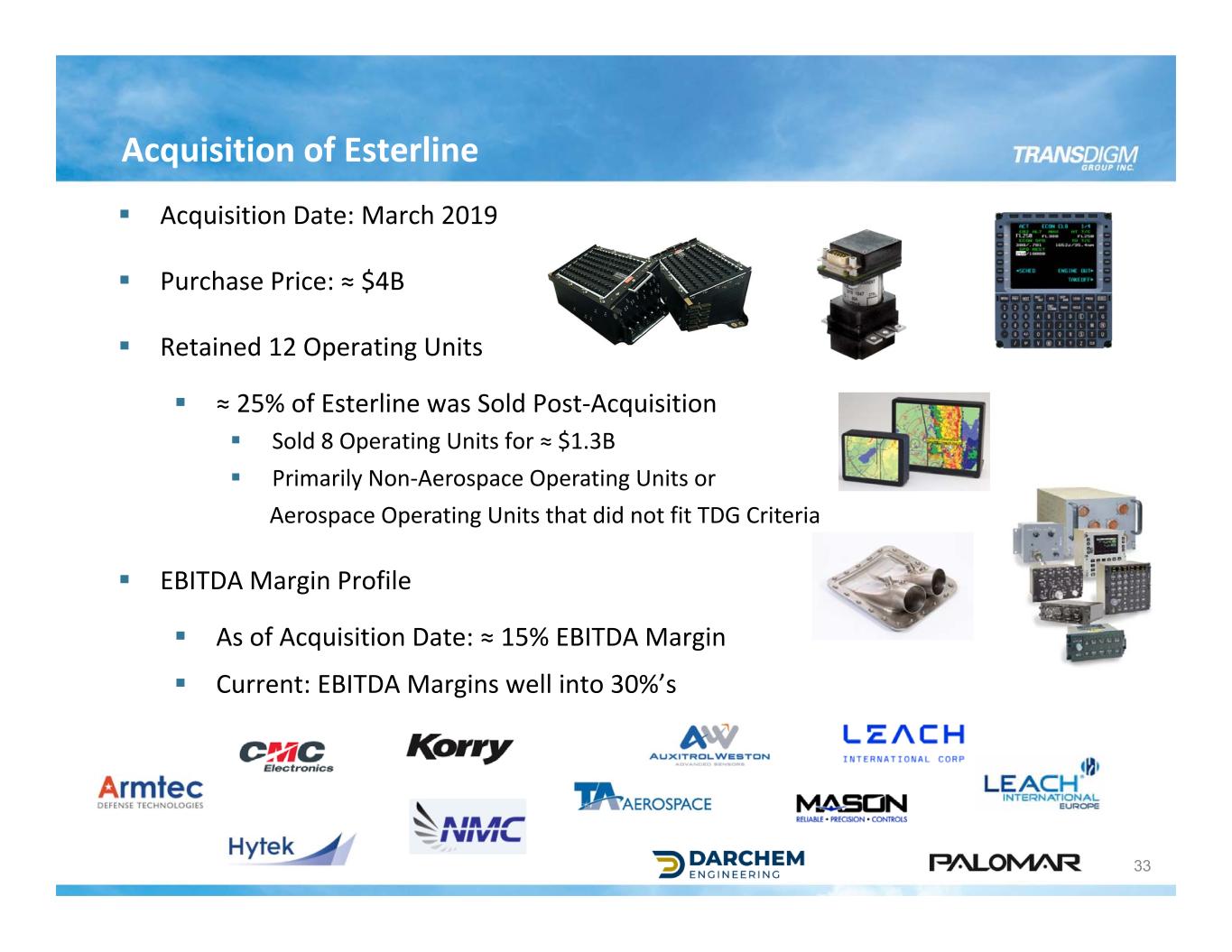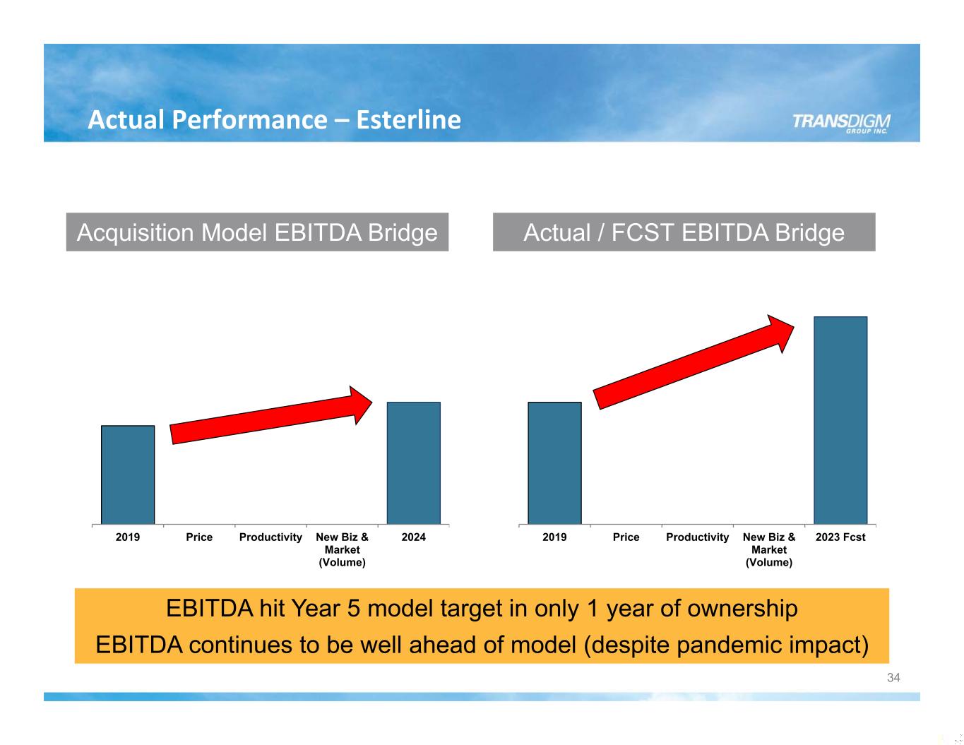 Acquisition of Esterline 33 Acquisition Date: March 2019 Purchase Price: ≈ $4B Retained 12 Operating Units ≈ 25% of Esterline was Sold Post‐Acquisition Sold 8 Operating Units for ≈ $1.3B Primarily Non‐Aerospace Operating Units or Aerospace Operating Units that did not fit TDG Criteria EBITDA Margin Profile As of Acquisition Date: ≈ 15% EBITDA Margin Current: EBITDA Margins well into 30%’s