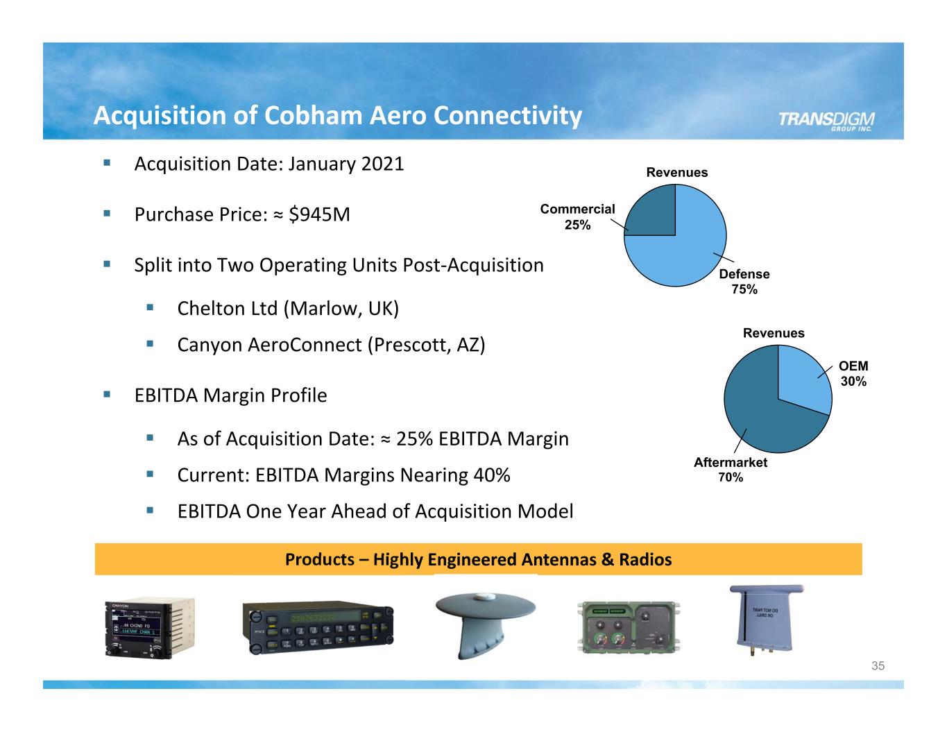 Actual Performance – Esterline 2019 Price Productivity New Biz & Market (Volume) 2024 2019 Price Productivity New Biz & Market (Volume) 2023 Fcst EBITDA hit Year 5 model target in only 1 year of ownership EBITDA continues to be well ahead of model (despite pandemic impact) Acquisition Model EBITDA Bridge Actual / FCST EBITDA Bridge 34