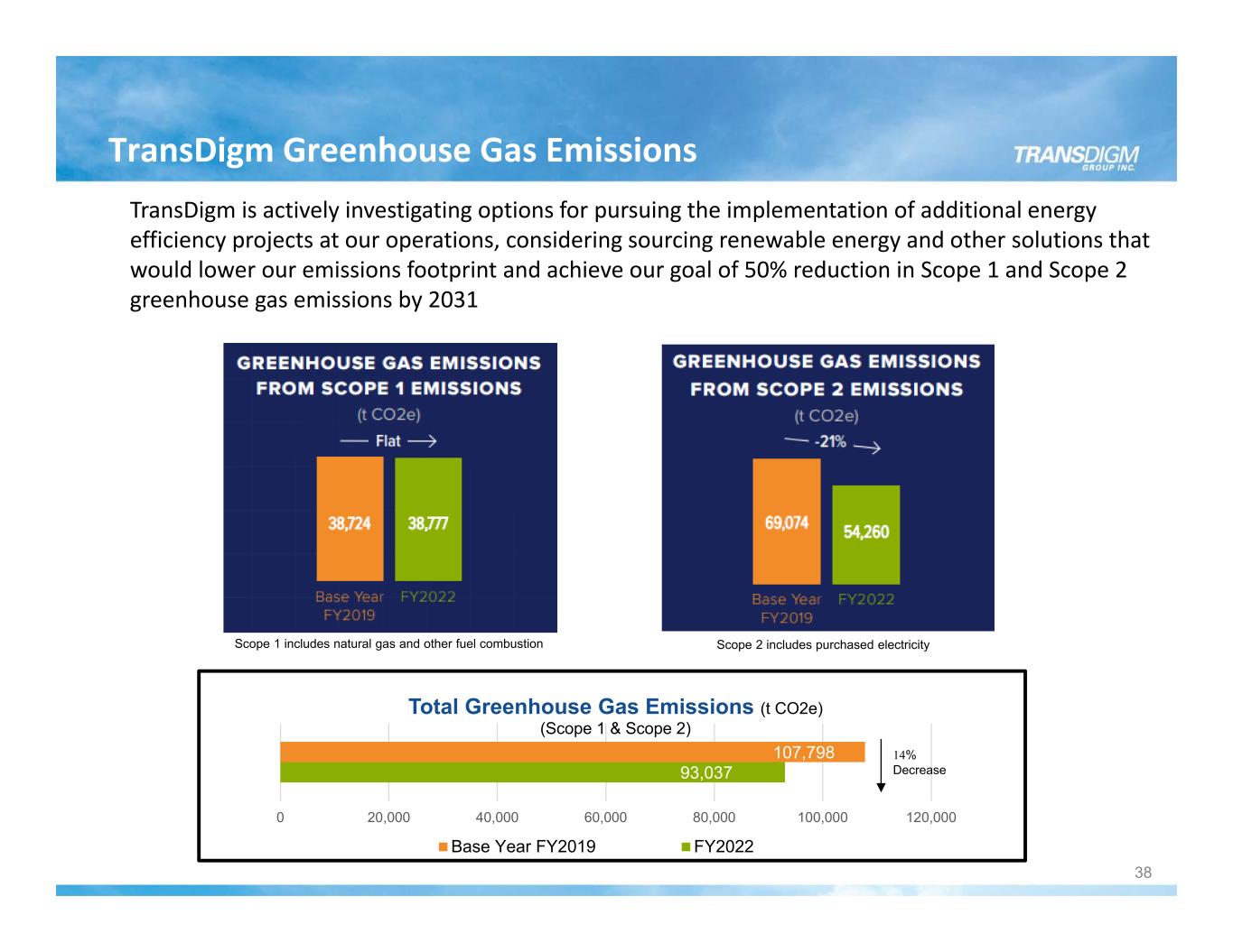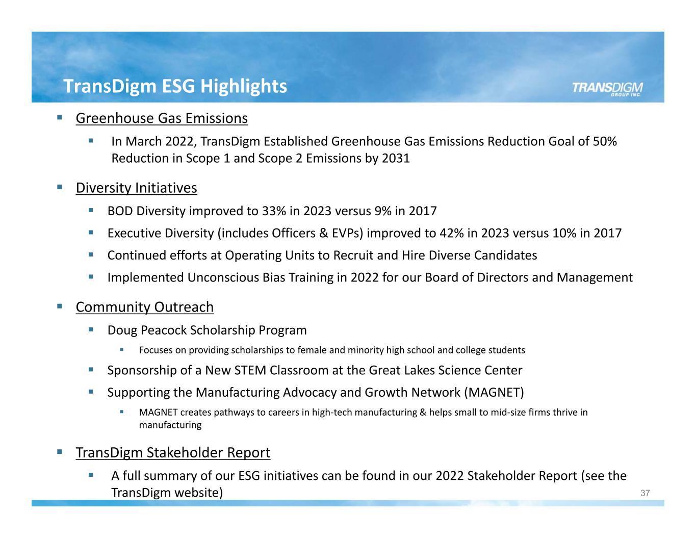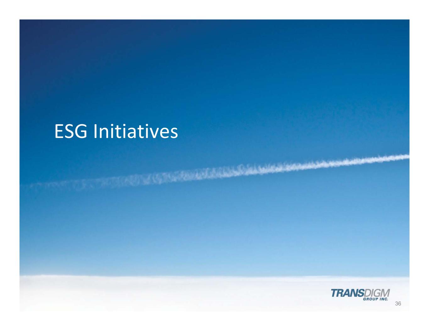 TransDigm ESG Highlights 37 Greenhouse Gas Emissions In March 2022, TransDigm Established Greenhouse Gas Emissions Reduction Goal of 50% Reduction in Scope 1 and Scope 2 Emissions by 2031 Diversity Initiatives BOD Diversity improved to 33% in 2023 versus 9% in 2017 Executive Diversity (includes Officers & EVPs) improved to 42% in 2023 versus 10% in 2017 Continued efforts at Operating Units to Recruit and Hire Diverse Candidates Implemented Unconscious Bias Training in 2022 for our Board of Directors and Management Community Outreach Doug Peacock Scholarship Program Focuses on providing scholarships to female and minority high school and college students Sponsorship of a New STEM Classroom at the Great Lakes Science Center Supporting the Manufacturing Advocacy and Growth Network (MAGNET) MAGNET creates pathways to careers in high‐tech manufacturing & helps small to mid‐size firms thrive in manufacturing TransDigm Stakeholder Report A full summary of our ESG initiatives can be found in our 2022 Stakeholder Report (see the TransDigm website)