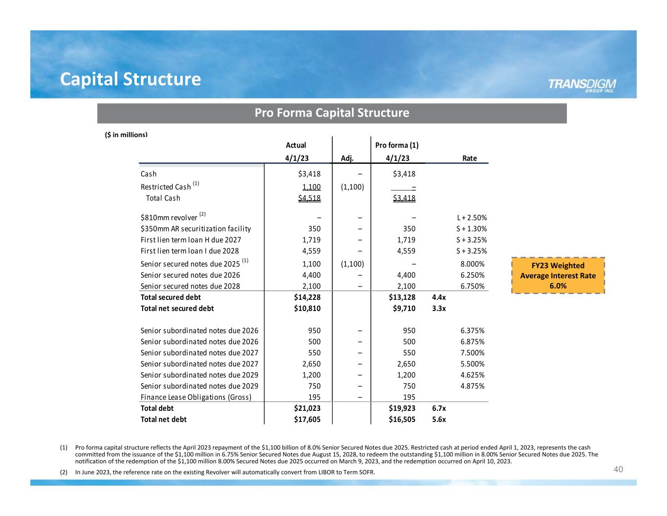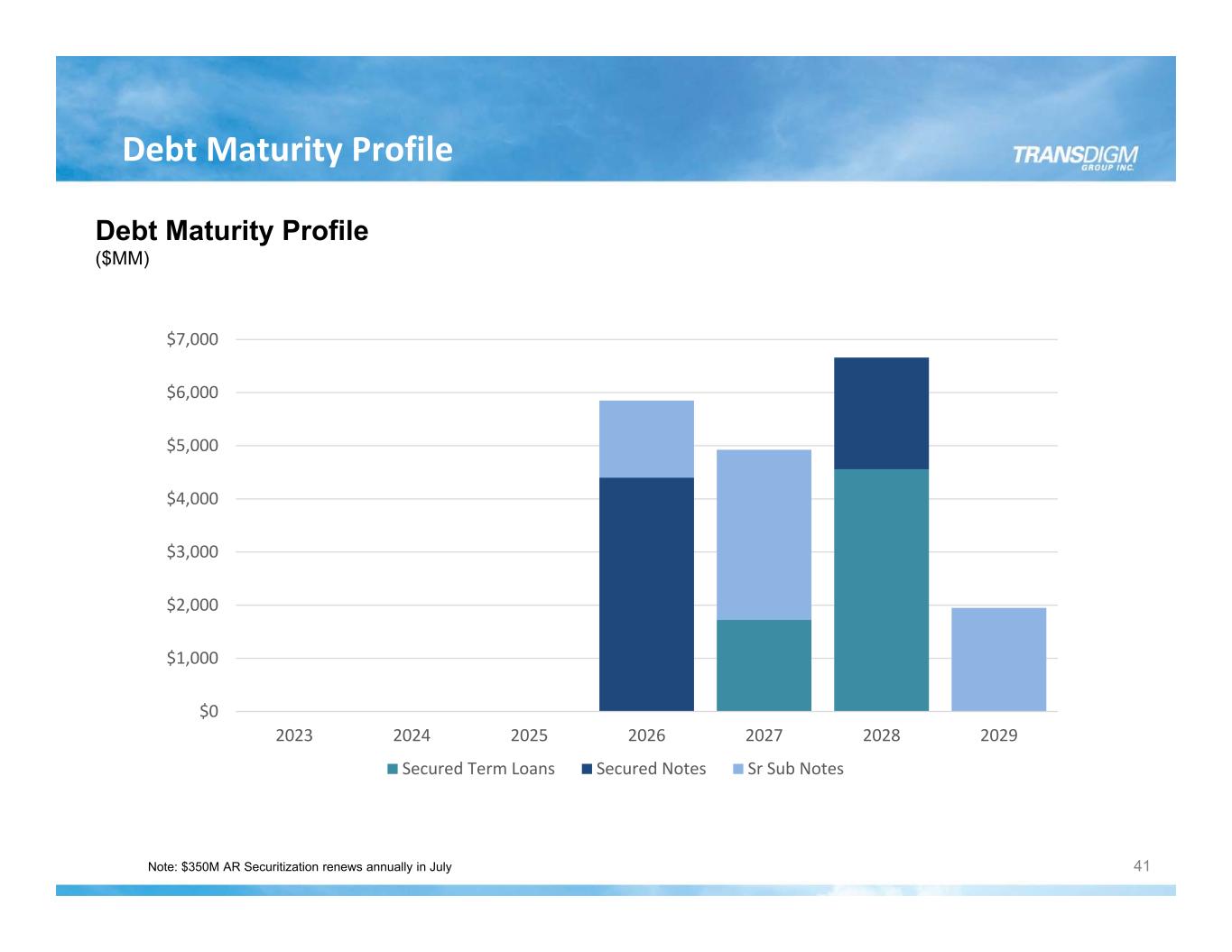 40 Capital Structure Pro Forma Capital Structure FY23 Weighted Average Interest Rate 6.0% ($ in millions) (1) Pro forma capital structure reflects the April 2023 repayment of the $1,100 billion of 8.0% Senior Secured Notes due 2025. Restricted cash at period ended April 1, 2023, represents the cash committed from the issuance of the $1,100 million in 6.75% Senior Secured Notes due August 15, 2028, to redeem the outstanding $1,100 million in 8.00% Senior Secured Notes due 2025. The notification of the redemption of the $1,100 million 8.00% Secured Notes due 2025 occurred on March 9, 2023, and the redemption occurred on April 10, 2023. (2) In June 2023, the reference rate on the existing Revolver will automatically convert from LIBOR to Term SOFR. Actual Pro forma (1) 4/1/23 Adj. 4/1/23 Rate Cash $3,418 – $3,418 Restricted Cash (1) 1,100 (1,100) – Total Cash $4,518 $3,418 $810mm revolver (2) – – – L + 2.50% $350mm AR securitization facil ity 350 – 350 S + 1.30% First lien term loan H due 2027 1,719 – 1,719 S + 3.25% First lien term loan I due 2028 4,559 – 4,559 S + 3.25% Senior secured notes due 2025 (1) 1,100 (1,100) – 8.000% Senior secured notes due 2026 4,400 – 4,400 6.250% Senior secured notes due 2028 2,100 – 2,100 6.750% Total secured debt $14,228 $13,128 4.4x Total net secured debt $10,810 $9,710 3.3x Senior subordinated notes due 2026 950 – 950 6.375% Senior subordinated notes due 2026 500 – 500 6.875% Senior subordinated notes due 2027 550 – 550 7.500% Senior subordinated notes due 2027 2,650 – 2,650 5.500% Senior subordinated notes due 2029 1,200 – 1,200 4.625% Senior subordinated notes due 2029 750 – 750 4.875% Finance Lease Obligations (Gross) 195 – 195 Total debt $21,023 $19,923 6.7x Total net debt $17,605 $16,505 5.6x