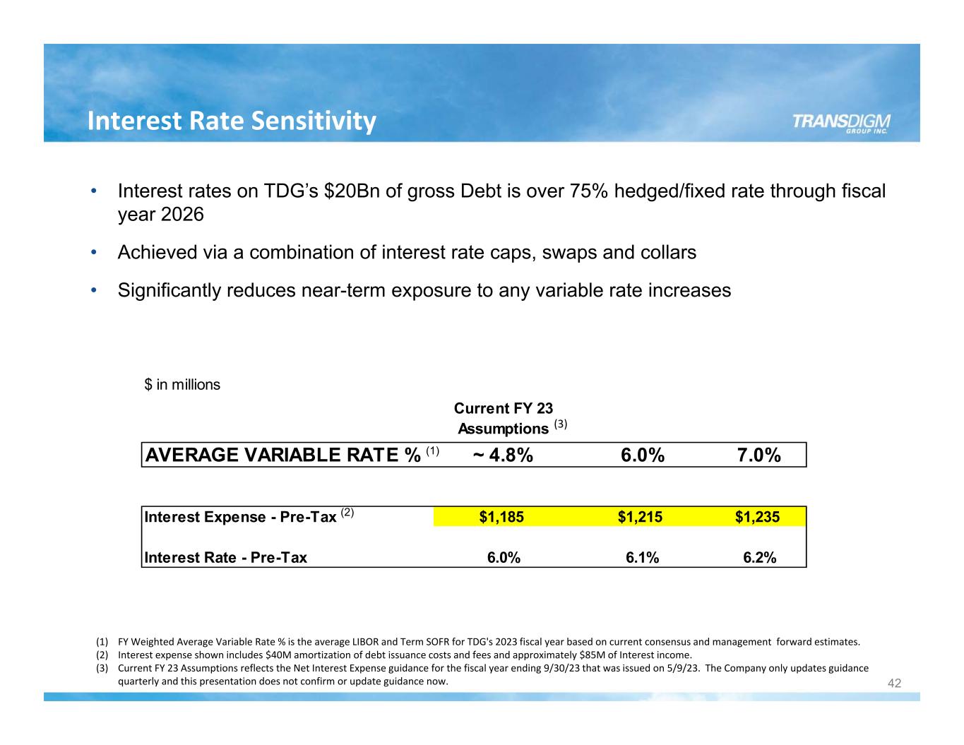 Interest Rate Sensitivity 42 • Interest rates on TDG’s $20Bn of gross Debt is over 75% hedged/fixed rate through fiscal year 2026 • Achieved via a combination of interest rate caps, swaps and collars • Significantly reduces near-term exposure to any variable rate increases (1) FY Weighted Average Variable Rate % is the average LIBOR and Term SOFR for TDG's 2023 fiscal year based on current consensus and management forward estimates. (2) Interest expense shown includes $40M amortization of debt issuance costs and fees and approximately $85M of Interest income. (3) Current FY 23 Assumptions reflects the Net Interest Expense guidance for the fiscal year ending 9/30/23 that was issued on 5/9/23. The Company only updates guidance quarterly and this presentation does not confirm or update guidance now. $ in millions Current FY 23 Assumptions AVERAGE VARIABLE RATE % ~ 4.8% 6.0% 7.0% Interest Expense - Pre-Tax $1,185 $1,215 $1,235 Interest Rate - Pre-Tax 6.0% 6.1% 6.2% (1) (2) (3)