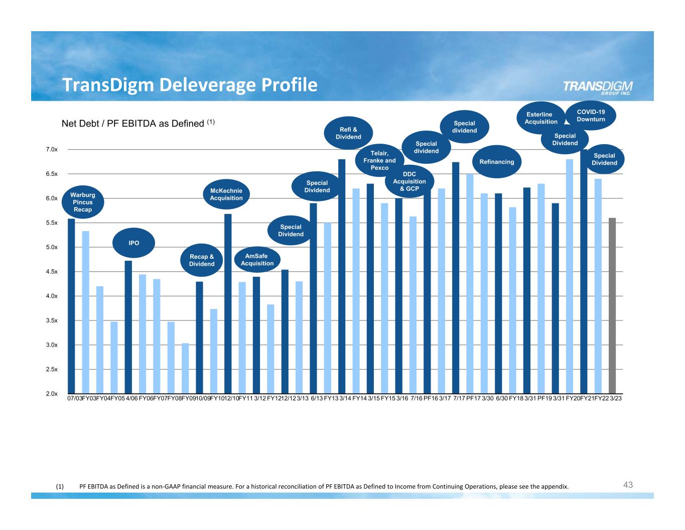 TransDigm Deleverage Profile 43 Net Debt / PF EBITDA as Defined (1) 2.0x 2.5x 3.0x 3.5x 4.0x 4.5x 5.0x 5.5x 6.0x 6.5x 7.0x 07/03FY03FY04FY05 4/06 FY06FY07FY08FY0910/09FY1012/10FY11 3/12 FY1212/123/13 6/13 FY13 3/14 FY14 3/15 FY15 3/16 7/16 PF16 3/17 7/17 PF17 3/30 6/30 FY18 3/31 PF19 3/31 FY20FY21FY22 3/23 Warburg Pincus Recap IPO Recap & Dividend McKechnie Acquisition AmSafe Acquisition Special Dividend Special Dividend Refi & Dividend Telair, Franke and Pexco DDC Acquisition & GCP Special dividend Special dividend Refinancing Esterline Acquisition Special Dividend COVID-19 Downturn Special Dividend (1) PF EBITDA as Defined is a non‐GAAP financial measure. For a historical reconciliation of PF EBITDA as Defined to Income from Continuing Operations, please see the appendix.