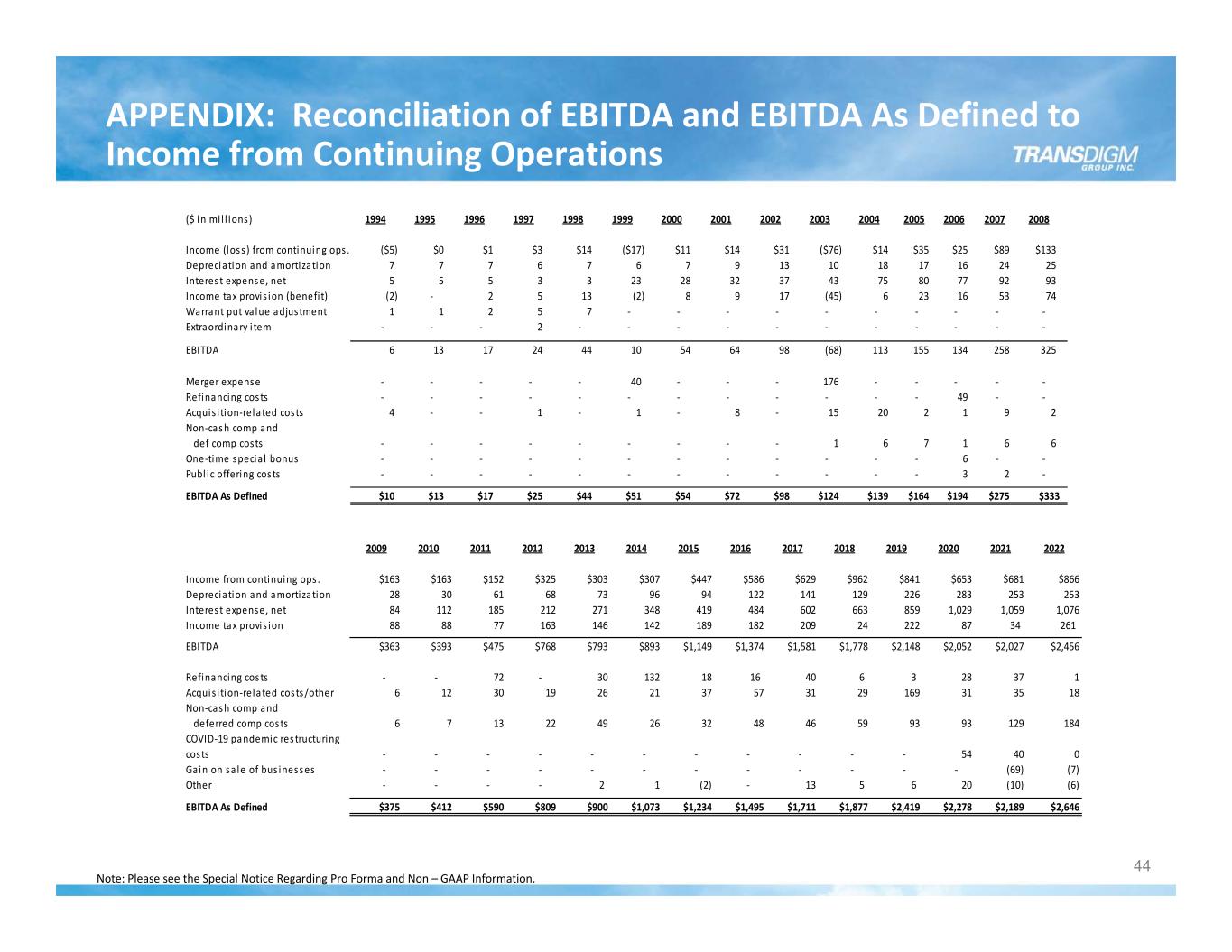 ($ in mi l l ions) 1994 1995 1996 1997 1998 1999 2000 2001 2002 2003 2004 2005 2006 2007 2008 Income (loss) from continuing ops . ($5) $0 $1 $3 $14 ($17) $11 $14 $31 ($76) $14 $35 $25 $89 $133 Depreciation and amortization 7 7 7 6 7 6 7 9 13 10 18 17 16 24 25 Interest expense, net 5 5 5 3 3 23 28 32 37 43 75 80 77 92 93 Income tax provis ion (benefi t) (2) ‐ 2 5 13 (2) 8 9 17 (45) 6 23 16 53 74 Warrant put va lue adjustment 1 1 2 5 7 ‐ ‐ ‐ ‐ ‐ ‐ ‐ ‐ ‐ ‐ Extraordinary i tem ‐ ‐ ‐ 2 ‐ ‐ ‐ ‐ ‐ ‐ ‐ ‐ ‐ ‐ ‐ EBITDA 6 13 17 24 44 10 54 64 98 (68) 113 155 134 258 325 Merger expense ‐ ‐ ‐ ‐ ‐ 40 ‐ ‐ ‐ 176 ‐ ‐ ‐ ‐ ‐ Refinancing costs ‐ ‐ ‐ ‐ ‐ ‐ ‐ ‐ ‐ ‐ ‐ ‐ 49 ‐ ‐ Acquis i tion‐related costs 4 ‐ ‐ 1 ‐ 1 ‐ 8 ‐ 15 20 2 1 9 2 Non‐cash comp and def comp costs ‐ ‐ ‐ ‐ ‐ ‐ ‐ ‐ ‐ 1 6 7 1 6 6 One‐time specia l bonus ‐ ‐ ‐ ‐ ‐ ‐ ‐ ‐ ‐ ‐ ‐ ‐ 6 ‐ ‐ Publ ic offering costs ‐ ‐ ‐ ‐ ‐ ‐ ‐ ‐ ‐ ‐ ‐ ‐ 3 2 ‐ EBITDA As Defined $10 $13 $17 $25 $44 $51 $54 $72 $98 $124 $139 $164 $194 $275 $333 APPENDIX: Reconciliation of EBITDA and EBITDA As Defined to Income from Continuing Operations 2009 2010 2011 2012 2013 2014 2015 2016 2017 2018 2019 2020 2021 2022 Income from continuing ops. $163 $163 $152 $325 $303 $307 $447 $586 $629 $962 $841 $653 $681 $866 Depreciation and amortization 28 30 61 68 73 96 94 122 141 129 226 283 253 253 Interest expense, net 84 112 185 212 271 348 419 484 602 663 859 1,029 1,059 1,076 Income tax provis ion 88 88 77 163 146 142 189 182 209 24 222 87 34 261 EBITDA $363 $393 $475 $768 $793 $893 $1,149 $1,374 $1,581 $1,778 $2,148 $2,052 $2,027 $2,456 Refinancing costs ‐ ‐ 72 ‐ 30 132 18 16 40 6 3 28 37 1 Acquis i tion‐related costs/other 6 12 30 19 26 21 37 57 31 29 169 31 35 18 Non‐cash comp and deferred comp costs 6 7 13 22 49 26 32 48 46 59 93 93 129 184 COVID‐19 pandemic res tructuring costs ‐ ‐ ‐ ‐ ‐ ‐ ‐ ‐ ‐ ‐ ‐ 54 40 0 Gain on sa le of bus inesses ‐ ‐ ‐ ‐ ‐ ‐ ‐ ‐ ‐ ‐ ‐ ‐ (69) (7) Other ‐ ‐ ‐ ‐ 2 1 (2) ‐ 13 5 6 20 (10) (6) EBITDA As Defined $375 $412 $590 $809 $900 $1,073 $1,234 $1,495 $1,711 $1,877 $2,419 $2,278 $2,189 $2,646 Note: Please see the Special Notice Regarding Pro Forma and Non – GAAP Information. 44