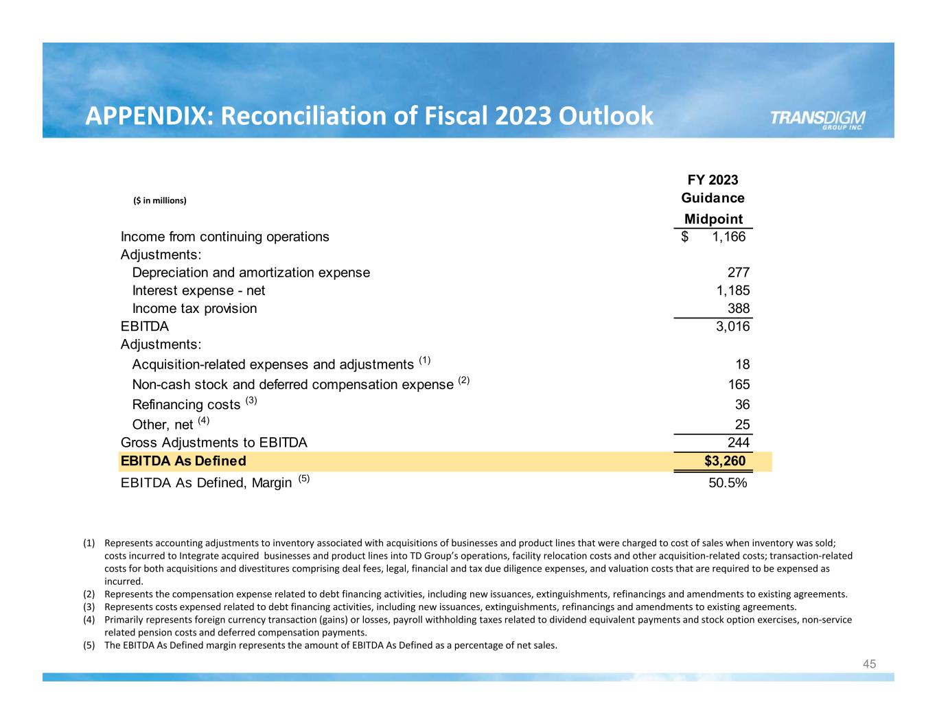 FY 2023 Guidance Midpoint Income from continuing operations 1,166$ Adjustments: Depreciation and amortization expense 277 Interest expense - net 1,185 Income tax provision 388 EBITDA 3,016 Adjustments: Acquisition-related expenses and adjustments (1) 18 Non-cash stock and deferred compensation expense (2) 165 Refinancing costs (3) 36 Other, net (4) 25 Gross Adjustments to EBITDA 244 EBITDA As Defined $3,260 EBITDA As Defined, Margin (5) 50.5% APPENDIX: Reconciliation of Fiscal 2023 Outlook 45 ($ in millions) (1) Represents accounting adjustments to inventory associated with acquisitions of businesses and product lines that were charged to cost of sales when inventory was sold; costs incurred to Integrate acquired businesses and product lines into TD Group’s operations, facility relocation costs and other acquisition‐related costs; transaction‐related costs for both acquisitions and divestitures comprising deal fees, legal, financial and tax due diligence expenses, and valuation costs that are required to be expensed as incurred. (2) Represents the compensation expense related to debt financing activities, including new issuances, extinguishments, refinancings and amendments to existing agreements. (3) Represents costs expensed related to debt financing activities, including new issuances, extinguishments, refinancings and amendments to existing agreements. (4) Primarily represents foreign currency transaction (gains) or losses, payroll withholding taxes related to dividend equivalent payments and stock option exercises, non‐service related pension costs and deferred compensation payments. (5) The EBITDA As Defined margin represents the amount of EBITDA As Defined as a percentage of net sales.