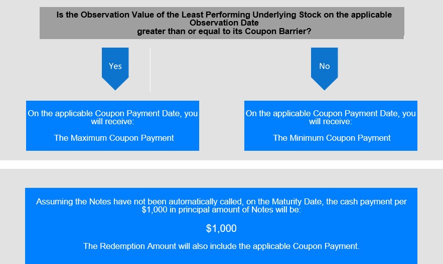 The Notes provide a monthly Maximum Coupon Payment of $7.792 per $1,000 in principal amount of Notes on the applicable Coupon Payment Date if, on the related monthly Observation Date, the Observation Value of each Underlying Stock is greater than or equal to its Coupon Barrier. Otherwise, if the Observation Value of any Underlying Stock on the related Observation Date is less than its Coupon Barrier, the Notes provide a monthly Minimum Coupon Payment of $0.2084 per $1,000 in principal amount of Notes on the applicable Coupon Payment Date.