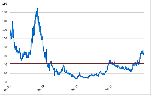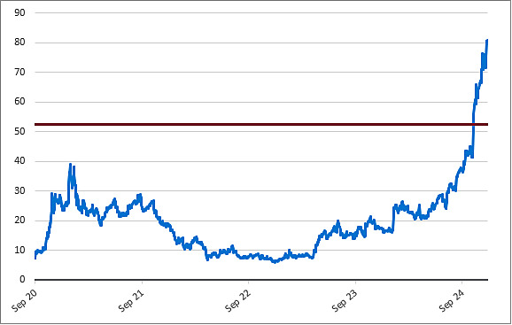 The following graph sets forth the daily historical performance of PLTR in the period from September 30, 2020 (the date PLTR began trading) through December 24, 2024. We obtained this historical data from Bloomberg L.P. We have not independently verified the accuracy or completeness of the information obtained from Bloomberg L.P. The Closing Market Prices reflected in the graph below may have been adjusted to reflect certain corporate actions, such as stock splits and reverse stock splits. The horizontal line in the graph represents PLTR’s hypothetical Coupon Barrier of $53.55 (rounded to two decimal places), which is 65% of PLTR’s hypothetical Starting Value of $82.38, which was its Closing Market Price on December 24, 2024. The actual Starting Value and Coupon Barrier will be determined on the pricing date.