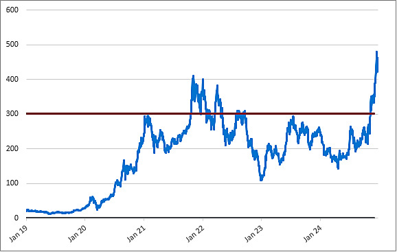 The following graph sets forth the daily historical performance of TSLA in the period from January 2, 2019 through December 24, 2024. We obtained this historical data from Bloomberg L.P. We have not independently verified the accuracy or completeness of the information obtained from Bloomberg L.P. The Closing Market Prices reflected in the graph below may have been adjusted to reflect certain corporate actions, such as stock splits and reverse stock splits. The horizontal line in the graph represents TSLA’s hypothetical Coupon Barrier of $300.48 (rounded to two decimal places), which is 65% of TSLA’s hypothetical Starting Value of $462.28, which was its Closing Market Price on December 24, 2024. The actual Starting Value and Coupon Barrier will be determined on the pricing date.