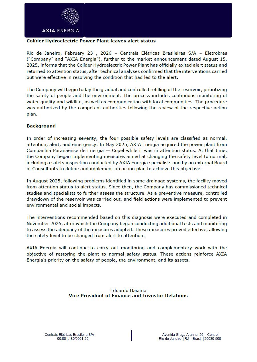 Centrais Elétricas Brasileira S/A 00.001.180/0001-26 Avenida Graça Aranha, 26 – Centro Rio de Janeiro │RJ – Brasil │20030-900 Colíder Hydroelectric Power Plant leaves alert status Rio de Janeiro, February 23 , 2026 – Centrais Elétricas Brasileiras S/A – Eletrobras (“Company” and “AXIA Energia”), further to the market announcement dated August 15, 2025, informs that the Colíder Hydroelectric Power Plant has officially exited alert status and returned to attention status, after technical analyses confirmed that the interventions carried out were effective in resolving the condition that had led to the alert. The Company will begin today the gradual and controlled refilling of the reservoir, prioritizing the safety of people and the environment. The process includes continuous monitoring of water quality and wildlife, as well as communication with local communities. The procedure was authorized by the competent authorities following the review of the respective action plan. Background In order of increasing severity, the four possible safety levels are classified as normal, attention, alert, and emergency. In May 2025, AXIA Energia acquired the power plant from Companhia Paranaense de Energia — Copel while it was in attention status. At that time, the Company began implementing measures aimed at changing the safety level to normal, including a safety inspection conducted by AXIA Energia specialists and by an external Board of Consultants to define and implement an action plan to achieve this objective. In August 2025, following problems identified in some drainage systems, the facility moved from attention status to alert status. Since then, the Company has commissioned technical studies and specialists to further assess the structure. As a preventive measure, controlled drawdown of the reservoir was carried out, and field actions were implemented to prevent environmental and social impacts. The interventions recommended based on this diagnosis were executed and completed in November 2025, after which the Company began conducting additional tests and monitoring to assess the adequacy of the measures adopted. These measures proved effective, allowing the safety level to be changed from alert to attention. AXIA Energia will continue to carry out monitoring and complementary work with the objective of restoring the plant to normal safety status. These actions reinforce AXIA Energia’s priority on the safety of people, the environment, and its assets. Eduardo Haiama Vice President of Finance and Investor Relations