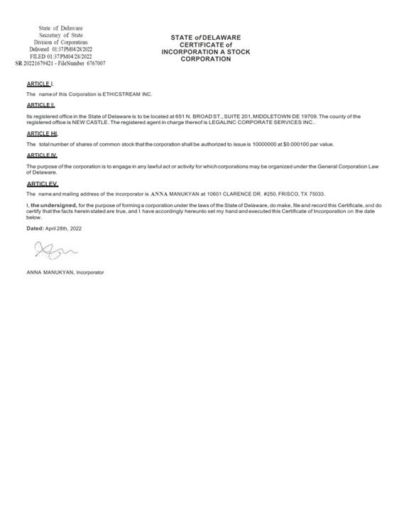 EthicStream Inc. is a Delaware corporation formed on April 28, 2022. We aim to provide corporate emitters with a complete, custom-tailored solution to their carbon emissions needs. Anchored by a technology that provides a clear picture of each emitter’s carbon footprint and an exclusive streaming platform for distributing carbon offsets into the marketplace, we create value for stockholders interested in the climate finance and emissions solutions sector, without the investor needing to learn all the nuances of the carbon crediting market. In addition to performing environmental, social, and corporate governmental (“ESG”) consulting services, we have signed a letter of intent (“ Letter of Intent”) with CarbonEthic Holdings, Inc. (“CarbonEthic”), a Canadian carbon credit manufacturing company that is currently developing a forest-based carbon offset project that would be the largest such project in the western hemisphere and one of the largest in the world. Pursuant to the Letter of Intent, the Company and CarbonEthic plan to enter into a carbon credit purchase and sale agreement (“Streaming Agreement”) that, upon execution would entitle the Company to purchase carbon credits from CarbonEthic at a significant discount and to resell them at market prices to the buyer of EthicStream’s choosing, which may include without limitation institutional investors, asset managers, or corporate clients looking to meet ESG or climate targets.