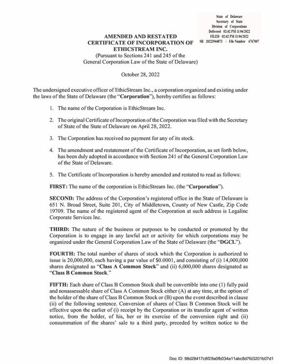 We have acted as counsel to EthicStream Inc., a Delaware corporation (the “Company”), in connection with the Company’s offer and sale (the “Offering”) of up to 1,000,000 shares of its Class A common stock, par value $0.0001 per share (the “Shares”), that are the subject of the Company’s offering statement on Form 1-A (as amended, the “Offering Statement”) filed by the Company with the U.S. Securities and Exchange Commission (the “Commission”) pursuant to Regulation A (“Regulation A”) under the Securities Act of 1933 (the “Securities Act”). The Shares are offered for sale to investors at a fixed price of $10.00 per Share.