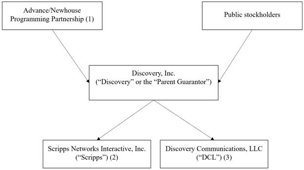 The following diagram illustrates, at a summary level, the ownership interests among Discovery, Scripps, DCL and Advance/Newhouse, as well as the material debt obligations of Scripps and DCL together with its subsidiaries as of December 31, 2020. As of December 31, 2020, Discovery’s outstanding indebtedness consisted of its guarantees of approximately $15.8 billion aggregate principal amount of DCL’s senior debt securities. The diagram is in general terms and does not include intermediate subsidiaries.