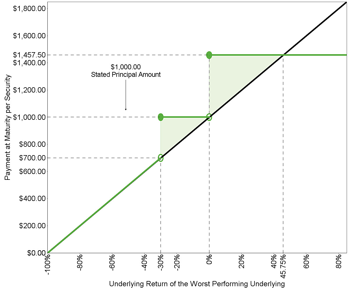 ▪The securities offer the potential for automatic early redemption at a premium following the first valuation date (other than the final valuation date) on which the closing value of the worst performing underlying on that valuation date is greater than or equal to its initial underlying value. If the securities are not automatically redeemed prior to maturity, the securities will provide for (i) repayment of the stated principal amount plus a premium at maturity if the final underlying value of the worst performing underlying on the final valuation date is greater than or equal to its initial underlying value or (ii) repayment of the stated principal amount at maturity, with no premium, if the final underlying value of the worst performing underlying on the final valuation date is less than its initial underlying value but greater than or equal to its final barrier value specified below. However, if the securities are not automatically redeemed prior to maturity and the final underlying value of the worst performing underlying on the final valuation date is less than its final barrier value, you will lose 1% of the stated principal amount of your securities for every 1% by which its final underlying value is less than its initial underlying value.