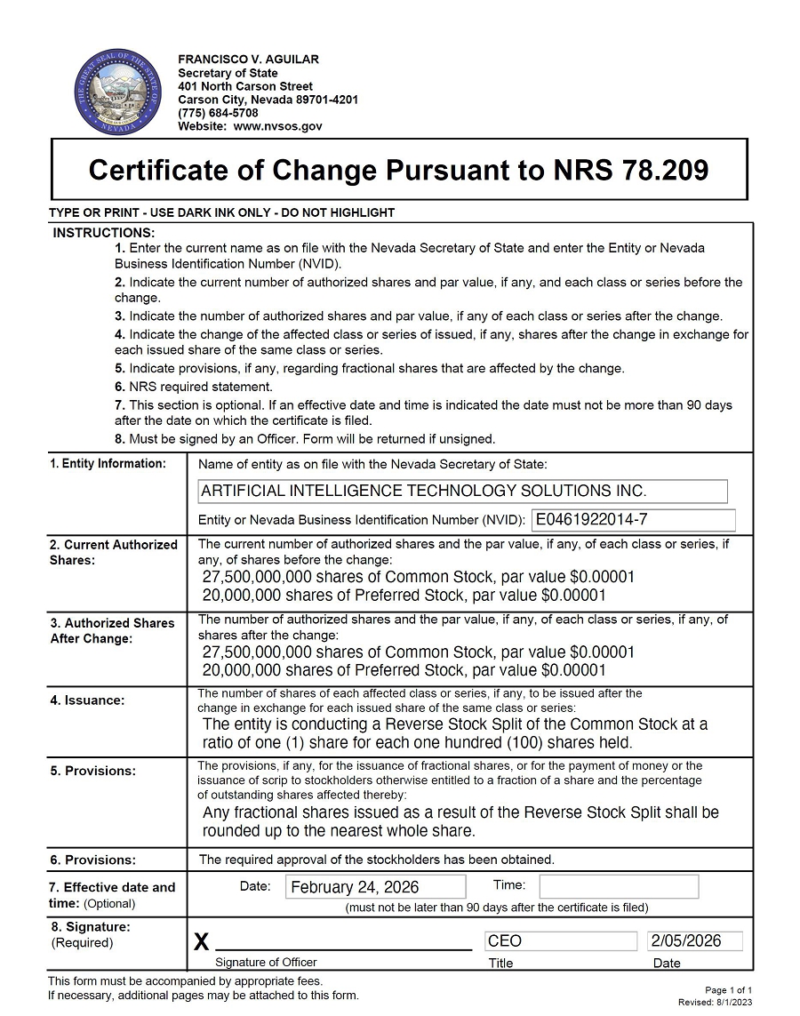 Pursuant to Nevada Revised Statutes (“NRS”) 78.320, the undersigned majority stockholder of Artificial Intelligence Technology Solutions, Inc. (the “Corporation”), holding a majority of the outstanding securities entitled to vote thereon (the “Majority Consenting Stockholder”), hereby consents in writing to the adoption of the following actions, without a meeting effective February 4, 2026 (the “Record Date”).