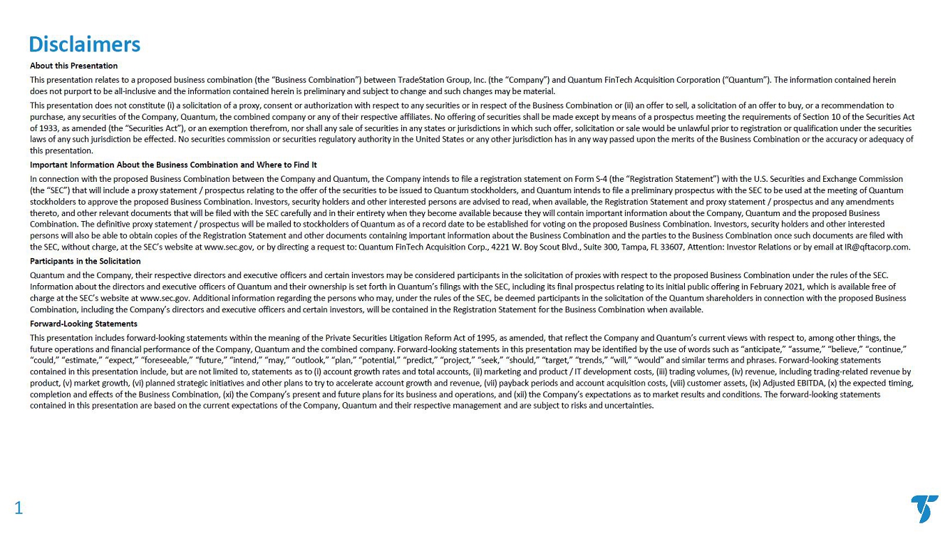 | About this Presentation This presentation relates to a proposed business combination (the “Business Combination”) between TradeStation Group, Inc. (the “Company”) and Quantum FinTech Acquisition Corporation (“Quantum”). The information contained herein does not purport to be all-inclusive and none of the Company, Quantum or their respective directors, officers, stockholders, affiliates or representatives makes any representation or warranty, express or implied, as to the accuracy, completeness or reliability of the information contained in this presentation or any other written or oral communication communicated to the recipient of this presentation in the course of their evaluation of the Company or Quantum. The information contained herein is preliminary and subject to change and such changes maybe material. This presentation does not constitute (i) a solicitation of a proxy, consent or authorization with respect to any securities or in respect of the Business Combination or (ii) an offer to sell, a solicitation of an offer to buy, or a recommendation to purchase, any securities of the Company, Quantum, the combined company or any of their respective affiliates.No offering of securities shall be made except by means of a prospectus meeting the requirements of Section 10 of the Securities Act of 1933, as amended, or an exemption therefrom, nor shall any sale of securities in any states or jurisdictions in which such offer, solicitation or sale would be unlawful prior to registration or qualification under the securities laws of any such jurisdiction be effected. No securities commission or securities regulatory authority in the United States or any other jurisdiction has in any way passed upon the merits of the Business Combination or the accuracy or adequacy of this presentation. You should not construe the contents of this presentation as legal, tax, accounting or investment advice or a recommendation. You should consult your own counsel and tax and financial advisors as to legal and related matters concerning the matters described herein, and, by accepting this presentation, you confirm that you are not relying upon the information contained herein to make any decision. Confidentiality The information in this presentation is highly confidential and is deemed to be confidential information subject to the non-disclosure agreement entered into between the recipient hereof and Quantum. The distribution of this presentation by an authorized recipient to any other person is unauthorized. Any photocopying, disclosure, reproduction or alteration of the contents of this presentation and any forwarding of any copy, or any portion, of this presentation is prohibited. The recipient of this presentation shall keep it and its contents confidential, shall not use it or its contents for any purpose other than as expressly authorized by the Company or Quantum, and shall be required to return or destroy all copies of this presentation or portions thereof in its possession promptly following a request for its return or destruction. By accepting delivery of this presentation, the recipient is deemed to agree to the foregoing confidentiality requirements. Forward-Looking Statements This presentation includes forward-looking statements within the meaning of the Private Securities Litigation Reform Act of 1995, as amended, that reflect the Company and Quantum’s current views with respect to, among other things, the future operations and financial performance of the Company, Quantum and the combined company. Forward-looking statements in this presentation may be identified by the use of words such as “anticipate,” “assume,” “believe,” “continue,” “could,” “estimate,” “expect,” “foreseeable,” “future,” “intend,” “may,” “outlook,” “plan,” “potential,” “predict,” “project,” “seek,” “should,” “target,” “trends,” “will,” “would” and similar terms and phrases. Forward-looking statements contained in this presentation include, but are not limited to, statements as to (i) account growth rates and total accounts, (ii) marketing and product / IT development costs, (iii) trading volumes, (iv) revenue, including trading-related revenue by product, (v) market growth, (vi) planned strategic initiatives and other plans to try to accelerate account growth and revenue, (vii) payback periods and account acquisition costs, (viii) customer assets, (ix) Adjusted EBITDA, (x) the expected timing, completion and effects of the BusinessCombination, (xi) the Company’s present and future plans for its business and operations, and (xii) the Company’s expectations as to market results and conditions. The forward-looking statements contained in this presentation are based on the current expectations of the Company, Quantum and their respective management and are subject to risks and uncertainties. No assurance can be given that future developments affecting the Company,Quantum or the combined company will be those that are anticipated. Actual results may differ materially from current expectations due to changes in global, regional or local economic, business, competitive, market,regulatory and other factors, many of which are beyond the control of the Company and Quantum. Should one or more of these risks or uncertainties materialize, or should any of the assumptions prove incorrect, actual results may vary in material respects from those projected in these forward-looking statements. Factors that could cause actual results to differ may emerge from time to time, and it is not possible to predict all of them. Disclaimers 1 |