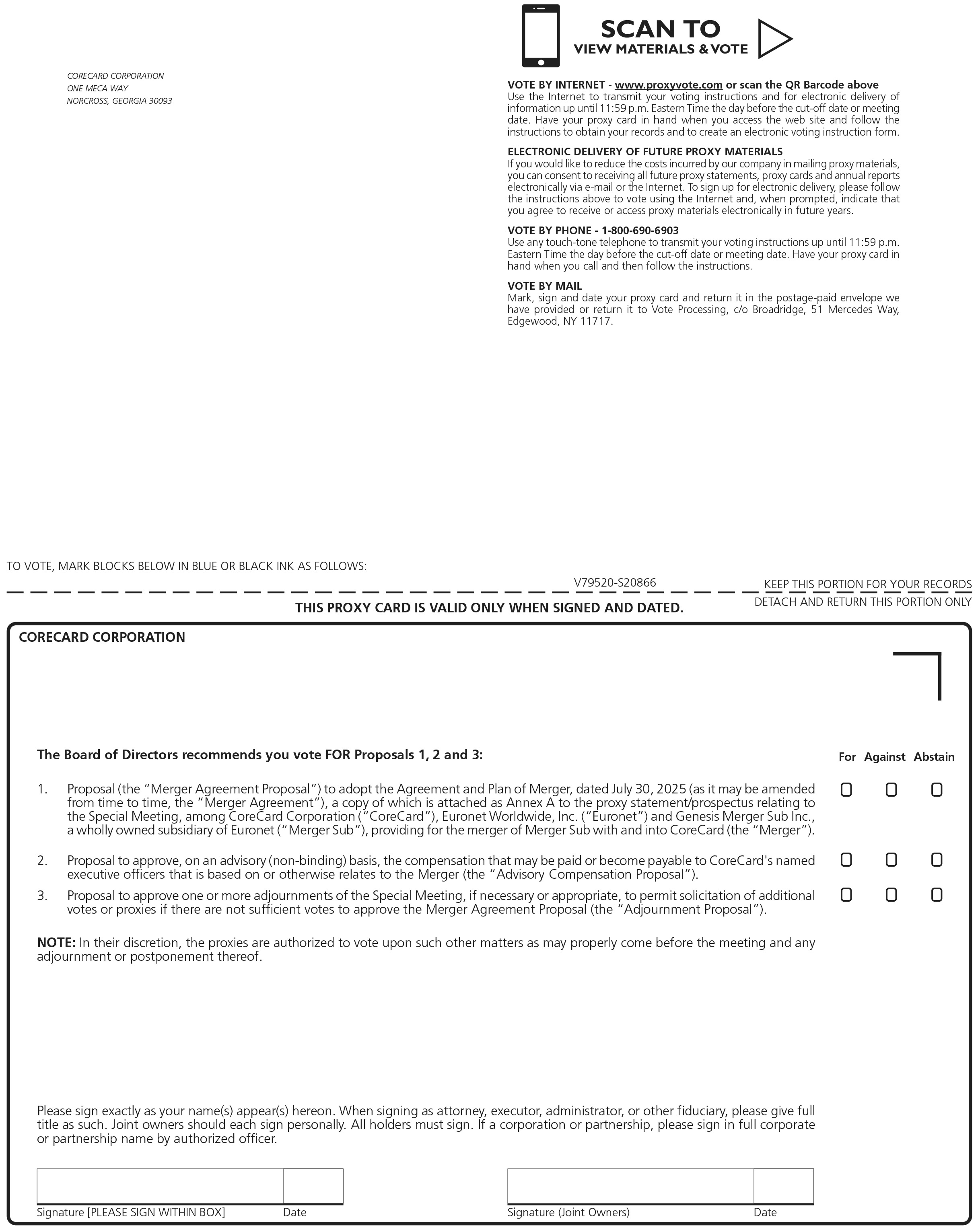 | a proposal (the “Merger Agreement Proposal”) to adopt the Agreement and Plan of Merger, dated July 30, 2025 (as it may be amended from time to time, the “Merger Agreement”), a copy of which is attached as Annex A to the accompanying proxy statement/prospectus, among CoreCard, Euronet Worldwide, Inc. (“Euronet”) and Genesis Merger Sub Inc., a wholly owned subsidiary of Euronet (“Merger Sub”), providing for the merger of Merger Sub with and into CoreCard (the “Merger”); |
