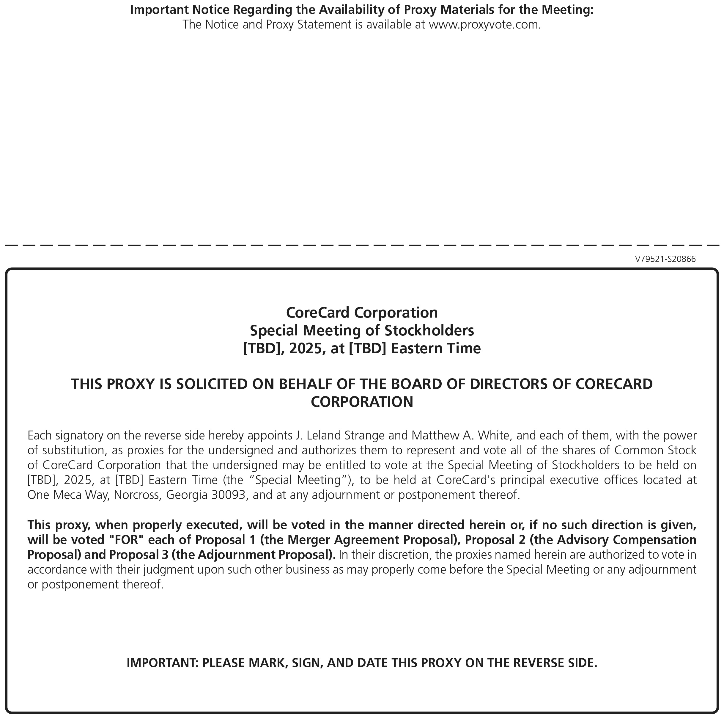 You are cordially invited to attend a special meeting of stockholders (the “Special Meeting”) of CoreCard Corporation (“CoreCard”), which will be held at CoreCard’s principal executive offices located at One Meca Way, Norcross, Georgia 30093 on [•], 2025, at [•] Eastern Time. The record date for the Special Meeting is [•], 2025 (the “Record Date”). Only holders of record of common stock, par value $0.01 per share, of CoreCard (“CoreCard Common Stock”) on the Record Date are entitled to receive notice of, and to vote at, the Special Meeting.