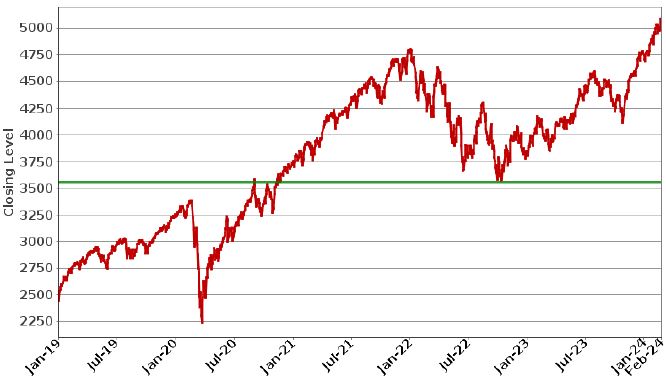 The graph below illustrates the performance of the SPX from January 1, 2019 to February 23, 2024, based on the daily Closing Levels as reported by Bloomberg L.P. (“Bloomberg”), without independent verification. We have not conducted any independent review or due diligence of the publicly available information from Bloomberg. On February 23, 2024, the Closing Level of the SPX was 5,088.80, which is its Initial Level. The green line indicates its Coupon Barrier and Downside Threshold of 3,562.16, which is equal to 70.00% of its Initial Level. The historical performance of the SPX should not be taken as an indication of its future performance, and no assurances can be given as to the level of the SPX at any time during the term of the Notes, including the Coupon Determination Dates. We cannot give you assurance that the performance of the SPX will result in the return of any of your investment.