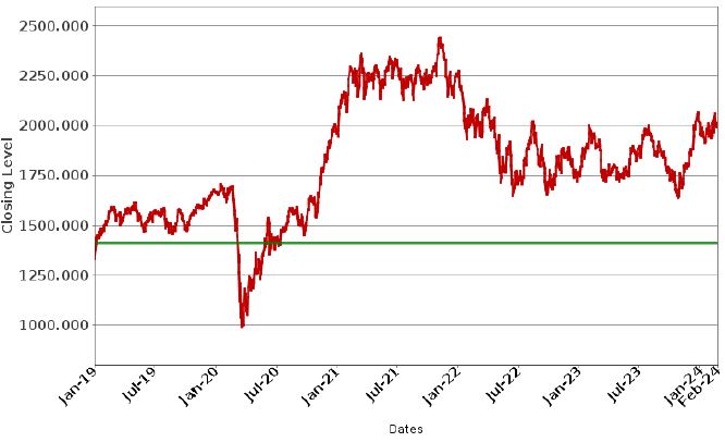 The graph below illustrates the performance of the RTY from January 1, 2019 to February 23, 2024, based on the daily Closing Levels as reported by Bloomberg, without independent verification. We have not conducted any independent review or due diligence of the publicly available information from Bloomberg. On February 23, 2024, the Closing Level of the RTY was 2,016.688, which is its Initial Level. The green line indicates its Coupon Barrier and Downside Threshold of 1,411.682, which is equal to 70.00% of its Initial Level. The historical performance of the RTY should not be taken as an indication of its future performance, and no assurances can be given as to the level of the RTY at any time during the term of the Notes, including the Coupon Determination Dates. We cannot give you assurance that the performance of the RTY will result in the return of any of your investment.