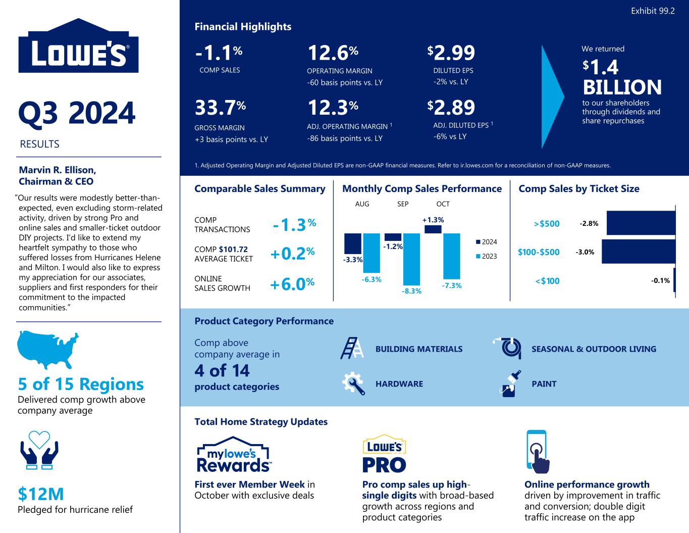 “Our results this quarter were modestly better-than-expected, even excluding storm-related activity, driven by high-single-digit positive comps in Pro, strong online sales and smaller-ticket outdoor DIY projects,” said Marvin R. Ellison, Lowe’s chairman, president and CEO. “I’d like to extend my heartfelt sympathy to those who suffered losses from Hurricanes Helene and Milton. I would also like to express my appreciation for our associates, suppliers and first responders for their commitment to the impacted communities. Next month at our Analyst and Investor Conference, I look forward to discussing our new growth and productivity initiatives, which underscore our confidence that we are well-positioned to capitalize on the expected recovery in home improvement.”