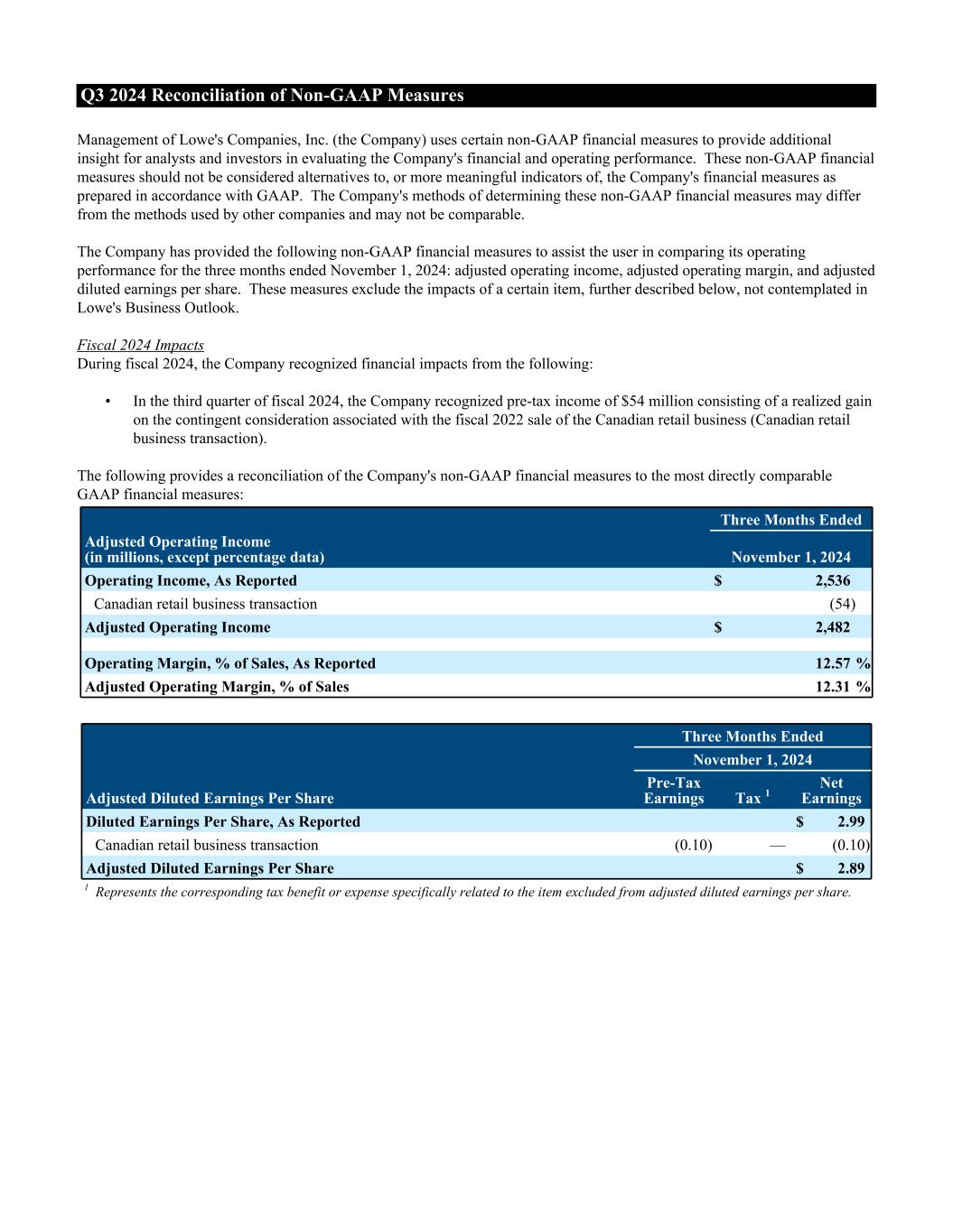 MOORESVILLE, N.C., Nov. 19, 2024 – Lowe’s Companies, Inc. (NYSE: LOW) today reported net earnings of $1.7 billion and diluted earnings per share (EPS) of $2.99 for the quarter ended Nov. 1, 2024, compared to diluted EPS of $3.06 in the third quarter of 2023. During the third quarter, the company recognized a $54 million pre-tax gain associated with the 2022 sale of the Canadian retail business. This positively impacted third quarter diluted EPS by $0.10. Excluding this gain, third quarter 2024 adjusted diluted EPS1 was $2.89.