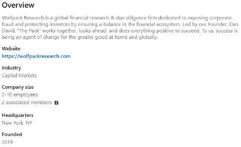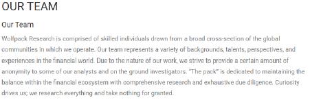 2. Holding itself out as a firm “dedicated to protecting investors by ensuring the natural balance of the financial ecosystem3” and “work[ing] tirelessly to uncover differentiated information on individual companies that investors can use to generate alpha,” Wolfpack Research represents to its readers that “all information is accurate and reliable, and has been obtained from public sources that we believe to be accurate and reliable.” See Report at p. 15. In reality, the fine-print legal disclaimer that Wolfpack Research includes at the very bottom of its “reports” tells the true story: “You are reading a short-biased opinion piece. Obviously, we will make money if the price of the covered issuer stock declines. As of the time and date of each report, Wolfpack is short the securities of, or derivatives linked to, the securities of the subject issuer.” See Exhibit A at p. 15 (emphasis added).