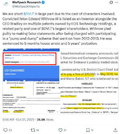 4 See “DVLT: A Joke Brought To You By A Promoter Sanctioned By The SEC Who Has Co-Authored Patents With A Convicted Felon Charged In An Elaborate Pump-And-Dump,” Wolfpack Research, dated October 31, 2025, (the “Report”) attached hereto as Exhibit A.