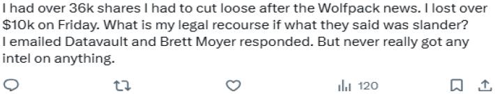 7. The disregard for Datavault’s public filings, ignorance of verifiable facts, and omission of critical context did not stop there, the Report also attacked Datavault’s personnel, claiming they are “top-tier bullshitters including a convicted felon,” and that they have “resume[s] that should terrify investors.” See id. at 3. Such reputational attacks are untrue and they spur public distrust when none is warranted. To amplify the false statements in order to further manipulate DVLT’s stock lower, Defendants launched a coordinated social media barrage to maximize market impact, reposting snippets of the report to X and “pinning” the article to the top of Wolfpack’s X account.