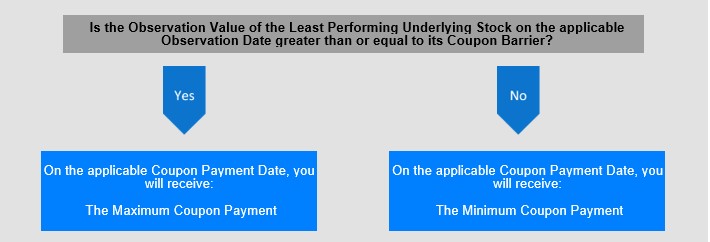 The Notes provide a monthly Maximum Coupon Payment of $6.667 per $1,000 in principal amount of Notes on the applicable Coupon Payment Date if, on the related monthly Observation Date, the Observation Value of each Underlying Stock is greater than or equal to its Coupon Barrier. Otherwise, if the Observation Value of any Underlying Stock on the related Observation Date is less than its Coupon Barrier, the Notes provide a monthly Minimum Coupon Payment of $0.2084 per $1,000 in principal amount of Notes on the applicable Coupon Payment Date.