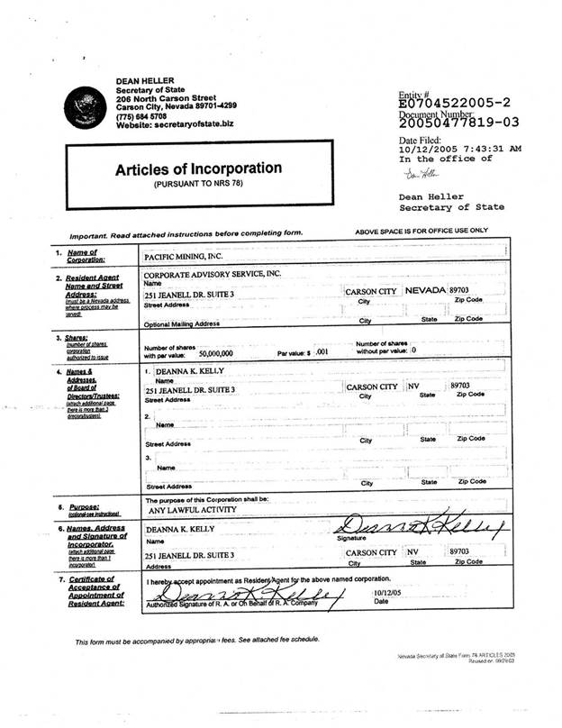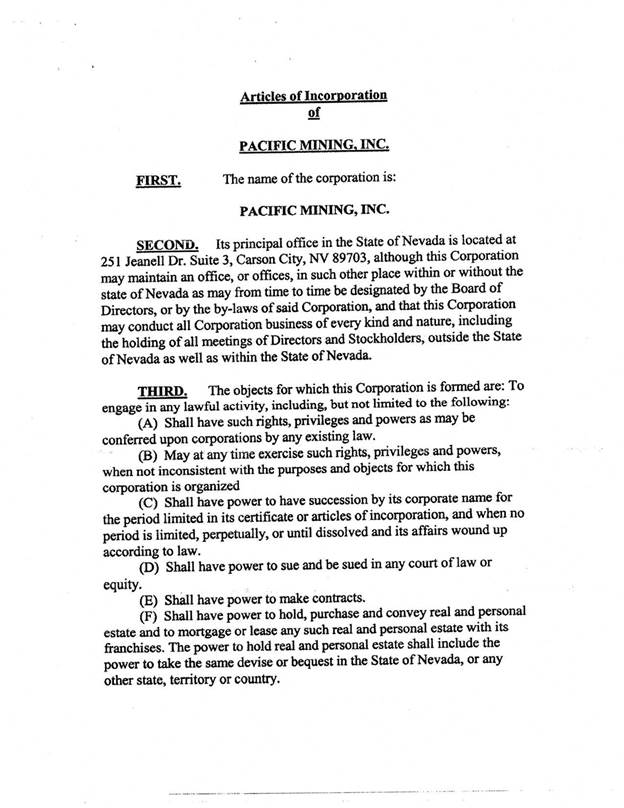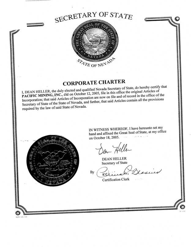 We were formed as Pacific Mining, Inc., a Nevada corporation, on October 12, 2005. On November 28, 2006, we changed our name to