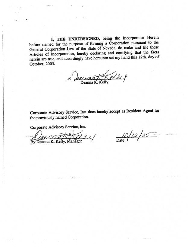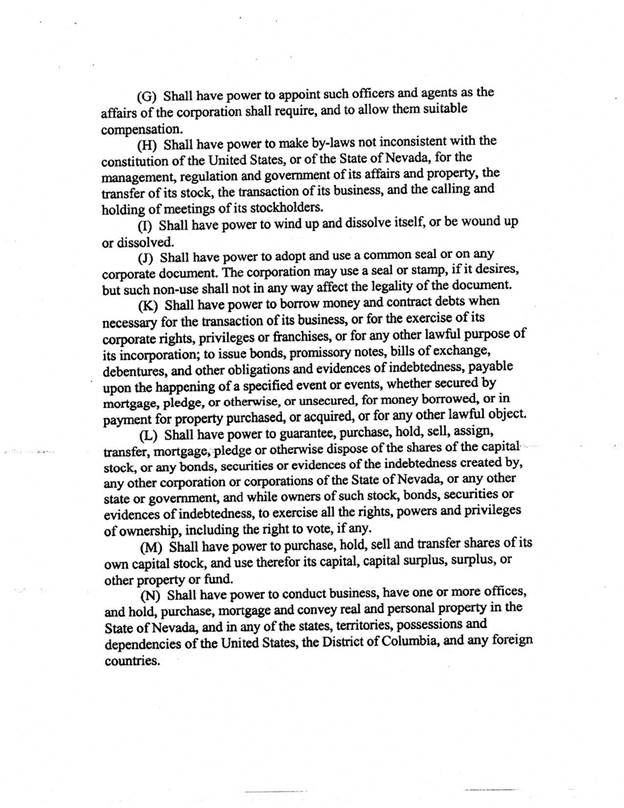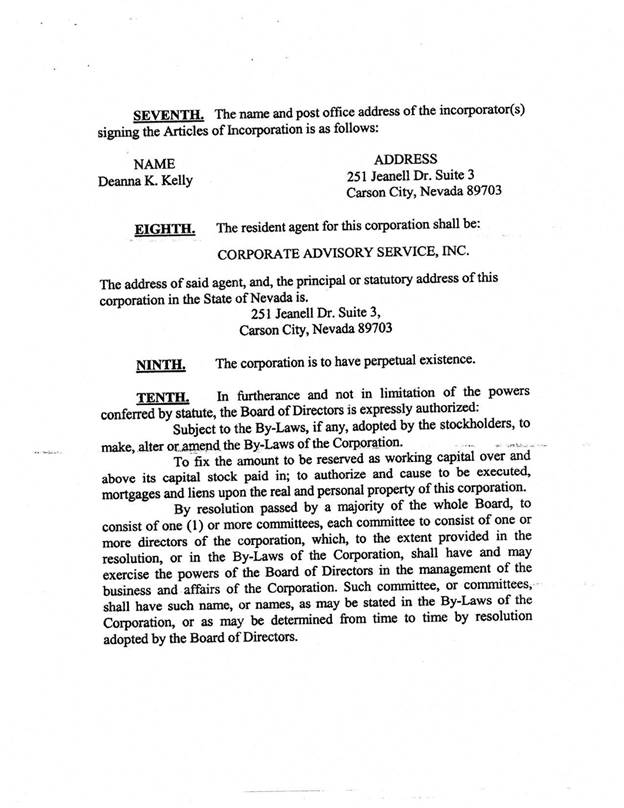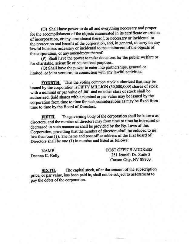 I have not been engaged to examine, nor have I examined, the Offering Statement for the purpose of determining the accuracy or completeness of the information included therein or the compliance and conformity thereof with the rules and regulations of the SEC or the requirements of Form 1-A, and I express no opinion with respect thereto. My forgoing opinion is strictly limited to matters of Nevada corporation law; and I do not express an opinion on the federal law of the United States of America or the law of any state or jurisdiction therein other than Nevada, as specified herein.