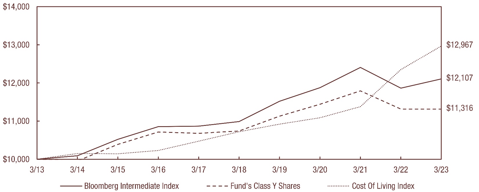 The following graph illustrates the value of $10,000 invested in the Class Y shares of Hawaiian Tax-Free Trust (the “Trust”) for the 10-year period ended March 31, 2023 as compared with the Bloomberg Municipal Bond: Quality Intermediate TR Unhedged Index*** (the “Bloomberg Intermediate Index”) and the Consumer Price Index (a cost of living index). The performance of each of the other classes is not shown in the graph but is included in the table below. It should be noted that the Bloomberg Intermediate Index does not include any operating expenses nor sales charges, and being nationally oriented, does not reflect state-specific bond market performance.