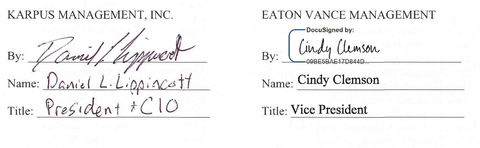 | 10. EVM is a Massachusetts business trust formed under a declaration of trust. Karpus acknowledges and agrees that in dealing with EVM, Karpus must look solely to the property of EVM for satisfaction of claims of any nature against them, as neither the trustees, officers, employees nor shareholders of EVM assume any personal liability in connection with its business or for obligations entered into on its behalf. EVM represents and warrants to Karpus that to its knowledge, none of the Tender Offer, the Initial Conditional Tender Offer or the Additional Conditional Tender Offer, or the occurrence of all three, would result in a failure to comply with asset coverage requirements applicable to any senior securities of the Fund that are issued and outstanding. |