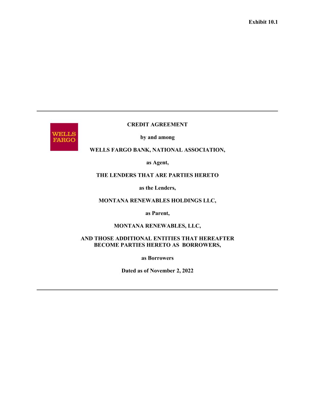 Exhibit 10.1 CREDIT AGREEMENT by and among WELLS FARGO BANK, NATIONAL ASSOCIATION, as Agent, THE LENDERS THAT ARE PARTIES HERETO as the Lenders, MONTANA RENEWABLES HOLDINGS LLC, as Parent, MONTANA RENEWABLES, LLC, AND THOSE ADDITIONAL ENTITIES THAT HEREAFTER BECOME PARTIES HERETO AS BORROWERS, as Borrowers Dated as of November 2, 2022