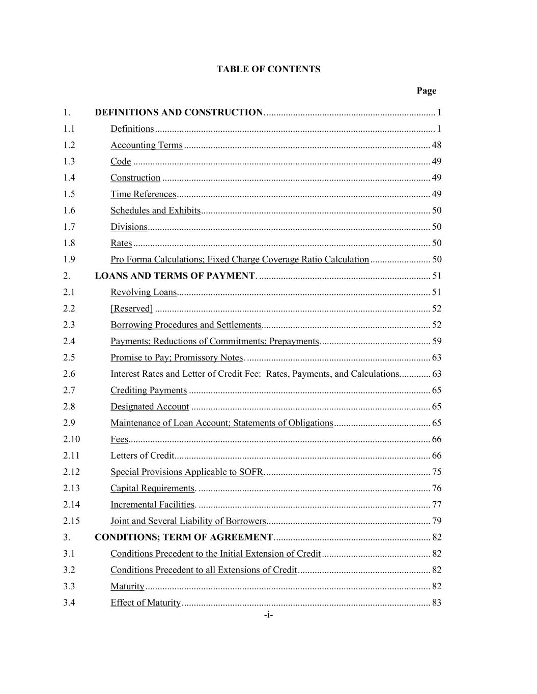 -i- TABLE OF CONTENTS Page 1. DEFINITIONS AND CONSTRUCTION. ...................................................................... 1 1.1 Definitions .................................................................................................................... 1 1.2 Accounting Terms ...................................................................................................... 48 1.3 Code ........................................................................................................................... 49 1.4 Construction ............................................................................................................... 49 1.5 Time References ......................................................................................................... 49 1.6 Schedules and Exhibits ............................................................................................... 50 1.7 Divisions ..................................................................................................................... 50 1.8 Rates ........................................................................................................................... 50 1.9 Pro Forma Calculations; Fixed Charge Coverage Ratio Calculation ......................... 50 2. LOANS AND TERMS OF PAYMENT. ....................................................................... 51 2.1 Revolving Loans......................................................................................................... 51 2.2 [Reserved] .................................................................................................................. 52 2.3 Borrowing Procedures and Settlements...................................................................... 52 2.4 Payments; Reductions of Commitments; Prepayments. ............................................. 59 2.5 Promise to Pay; Promissory Notes. ............................................................................ 63 2.6 Interest Rates and Letter of Credit Fee: Rates, Payments, and Calculations. ............ 63 2.7 Crediting Payments .................................................................................................... 65 2.8 Designated Account ................................................................................................... 65 2.9 Maintenance of Loan Account; Statements of Obligations ........................................ 65 2.10 Fees. ............................................................................................................................ 66 2.11 Letters of Credit.......................................................................................................... 66 2.12 Special Provisions Applicable to SOFR. .................................................................... 75 2.13 Capital Requirements. ................................................................................................ 76 2.14 Incremental Facilities. ................................................................................................ 77 2.15 Joint and Several Liability of Borrowers. ................................................................... 79 3. CONDITIONS; TERM OF AGREEMENT. ................................................................ 82 3.1 Conditions Precedent to the Initial Extension of Credit ............................................. 82 3.2 Conditions Precedent to all Extensions of Credit ....................................................... 82 3.3 Maturity ...................................................................................................................... 82 3.4 Effect of Maturity ....................................................................................................... 83