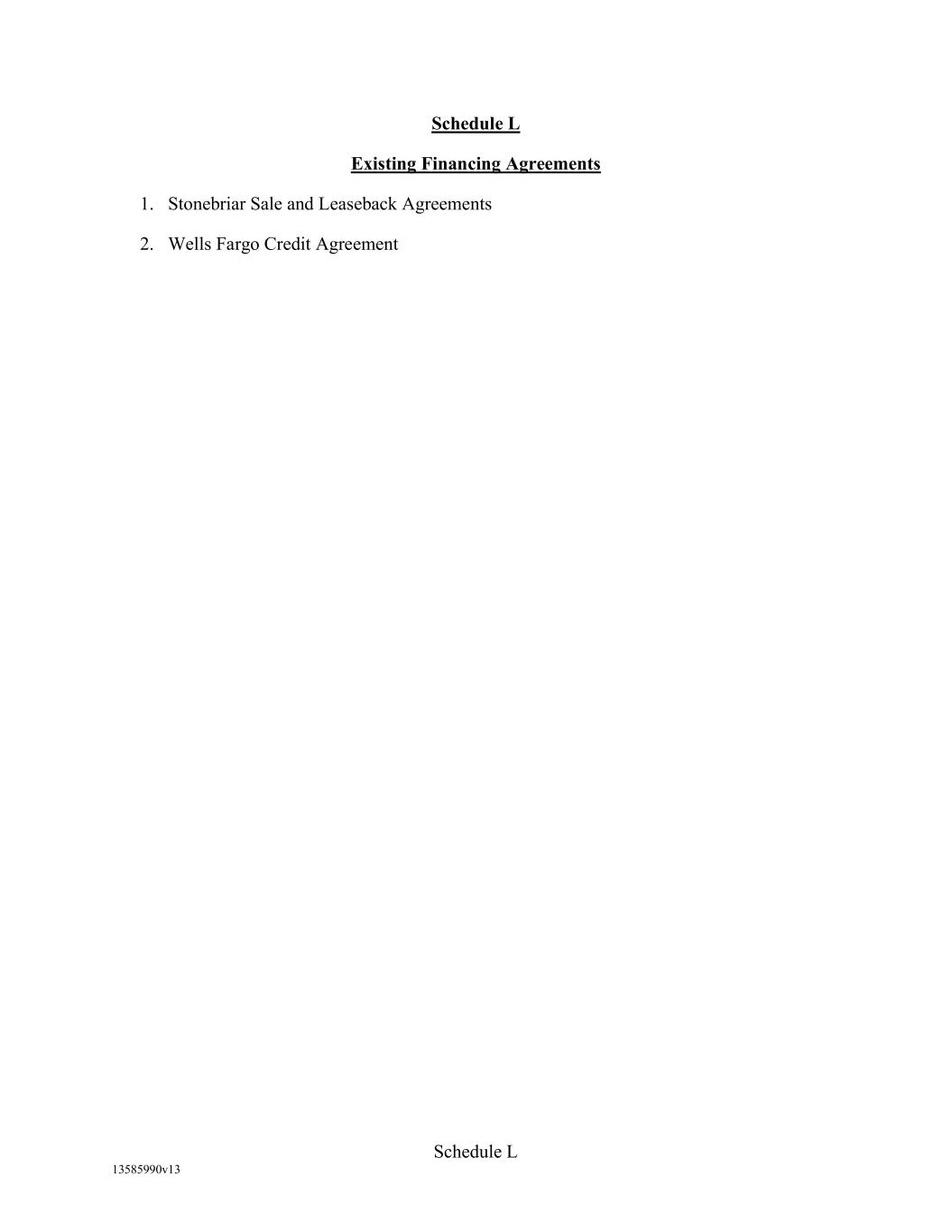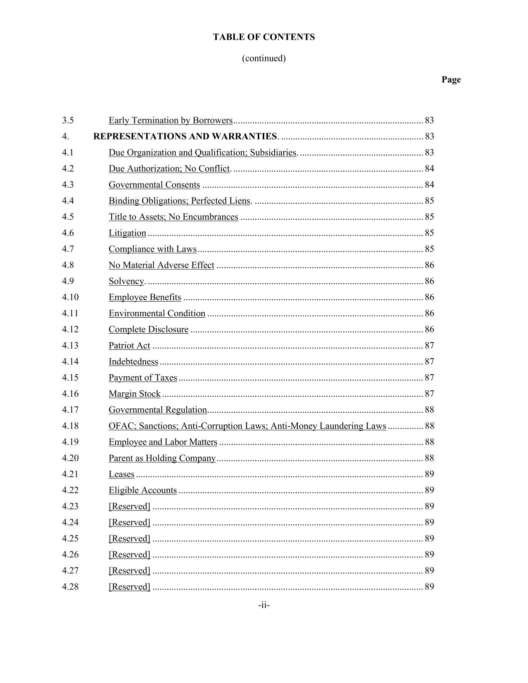TABLE OF CONTENTS (continued) Page -ii- 3.5 Early Termination by Borrowers ................................................................................ 83 4. REPRESENTATIONS AND WARRANTIES. ............................................................ 83 4.1 Due Organization and Qualification; Subsidiaries. .................................................... 83 4.2 Due Authorization; No Conflict. ................................................................................ 84 4.3 Governmental Consents ............................................................................................. 84 4.4 Binding Obligations; Perfected Liens. ....................................................................... 85 4.5 Title to Assets; No Encumbrances ............................................................................. 85 4.6 Litigation .................................................................................................................... 85 4.7 Compliance with Laws ............................................................................................... 85 4.8 No Material Adverse Effect ....................................................................................... 86 4.9 Solvency. .................................................................................................................... 86 4.10 Employee Benefits ..................................................................................................... 86 4.11 Environmental Condition ........................................................................................... 86 4.12 Complete Disclosure .................................................................................................. 86 4.13 Patriot Act .................................................................................................................. 87 4.14 Indebtedness ............................................................................................................... 87 4.15 Payment of Taxes ....................................................................................................... 87 4.16 Margin Stock .............................................................................................................. 87 4.17 Governmental Regulation ........................................................................................... 88 4.18 OFAC; Sanctions; Anti-Corruption Laws; Anti-Money Laundering Laws ............... 88 4.19 Employee and Labor Matters ...................................................................................... 88 4.20 Parent as Holding Company ....................................................................................... 88 4.21 Leases ......................................................................................................................... 89 4.22 Eligible Accounts ....................................................................................................... 89 4.23 [Reserved] .................................................................................................................. 89 4.24 [Reserved] .................................................................................................................. 89 4.25 [Reserved] .................................................................................................................. 89 4.26 [Reserved] .................................................................................................................. 89 4.27 [Reserved] .................................................................................................................. 89 4.28 [Reserved] .................................................................................................................. 89