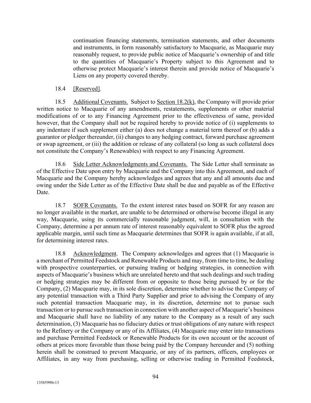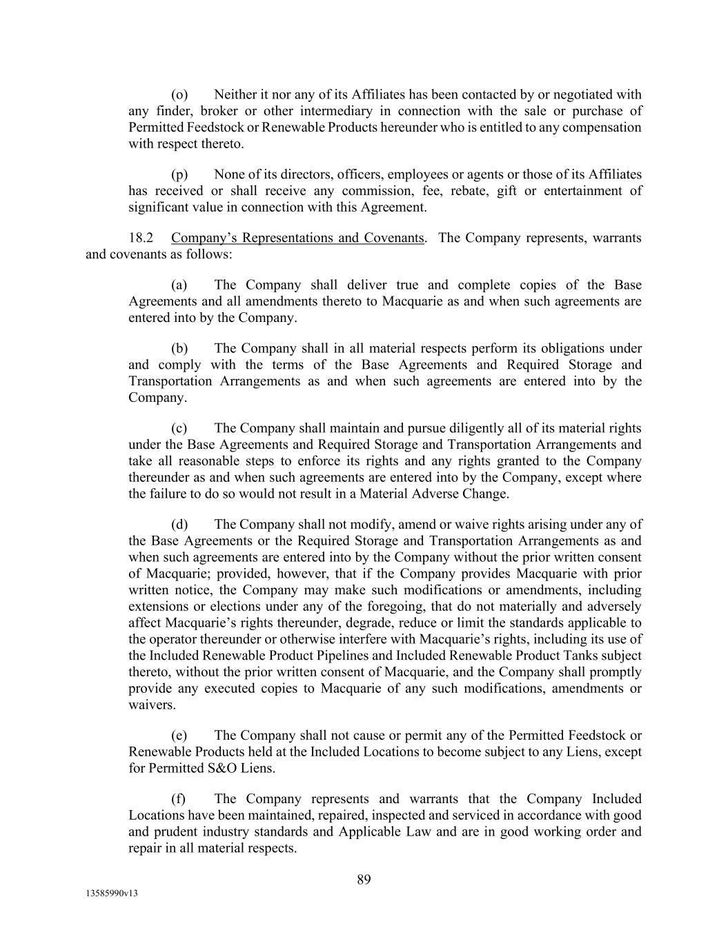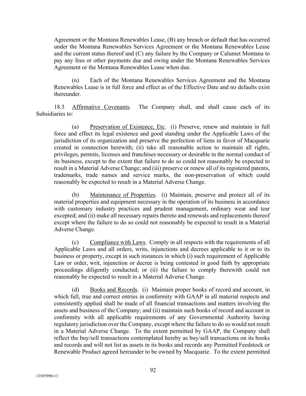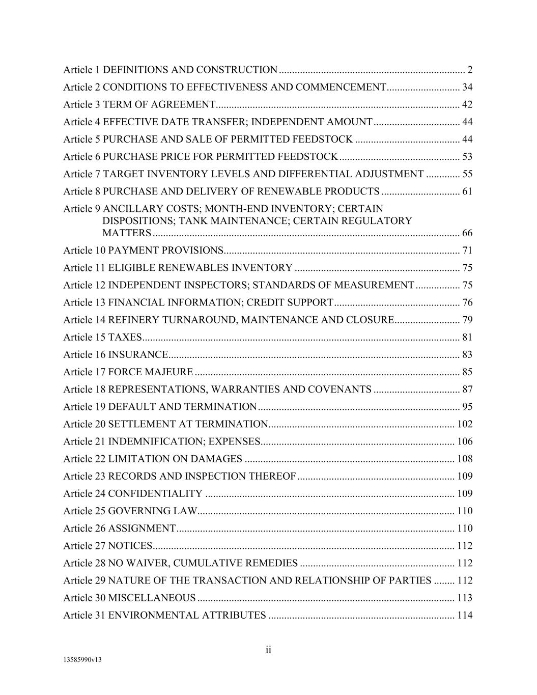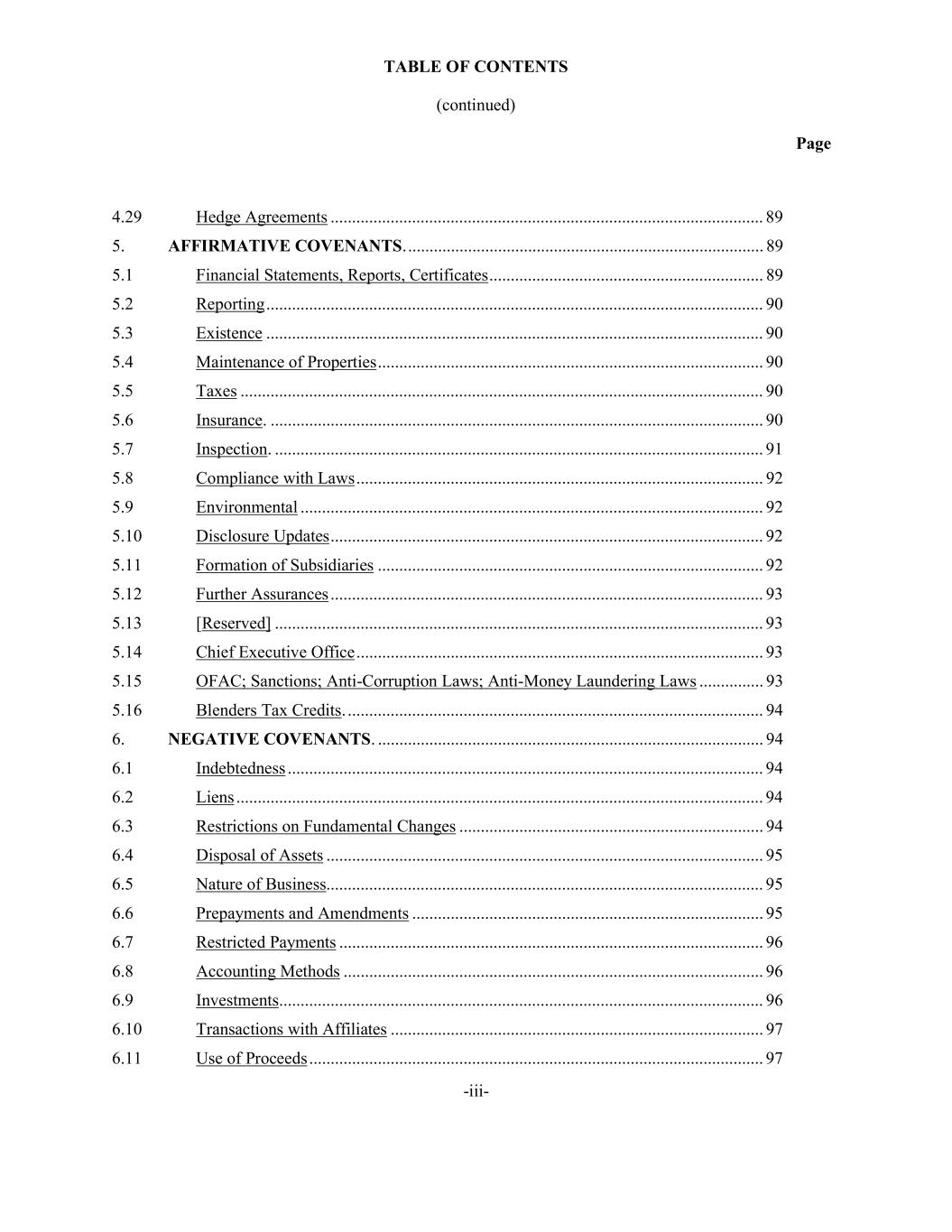 TABLE OF CONTENTS (continued) Page -iii- 4.29 Hedge Agreements ..................................................................................................... 89 5. AFFIRMATIVE COVENANTS. ................................................................................... 89 5.1 Financial Statements, Reports, Certificates ................................................................ 89 5.2 Reporting .................................................................................................................... 90 5.3 Existence .................................................................................................................... 90 5.4 Maintenance of Properties .......................................................................................... 90 5.5 Taxes .......................................................................................................................... 90 5.6 Insurance. ................................................................................................................... 90 5.7 Inspection. .................................................................................................................. 91 5.8 Compliance with Laws ............................................................................................... 92 5.9 Environmental ............................................................................................................ 92 5.10 Disclosure Updates ..................................................................................................... 92 5.11 Formation of Subsidiaries .......................................................................................... 92 5.12 Further Assurances ..................................................................................................... 93 5.13 [Reserved] .................................................................................................................. 93 5.14 Chief Executive Office ............................................................................................... 93 5.15 OFAC; Sanctions; Anti-Corruption Laws; Anti-Money Laundering Laws ............... 93 5.16 Blenders Tax Credits. ................................................................................................. 94 6. NEGATIVE COVENANTS. .......................................................................................... 94 6.1 Indebtedness ............................................................................................................... 94 6.2 Liens ........................................................................................................................... 94 6.3 Restrictions on Fundamental Changes ....................................................................... 94 6.4 Disposal of Assets ...................................................................................................... 95 6.5 Nature of Business...................................................................................................... 95 6.6 Prepayments and Amendments .................................................................................. 95 6.7 Restricted Payments ................................................................................................... 96 6.8 Accounting Methods .................................................................................................. 96 6.9 Investments ................................................................................................................. 96 6.10 Transactions with Affiliates ....................................................................................... 97 6.11 Use of Proceeds .......................................................................................................... 97