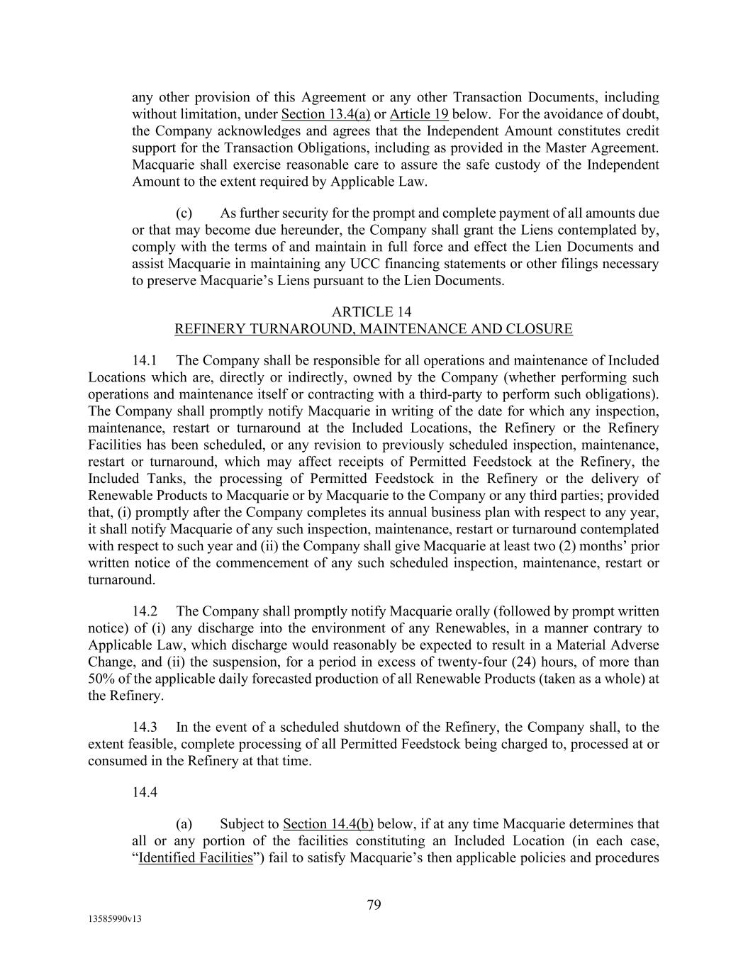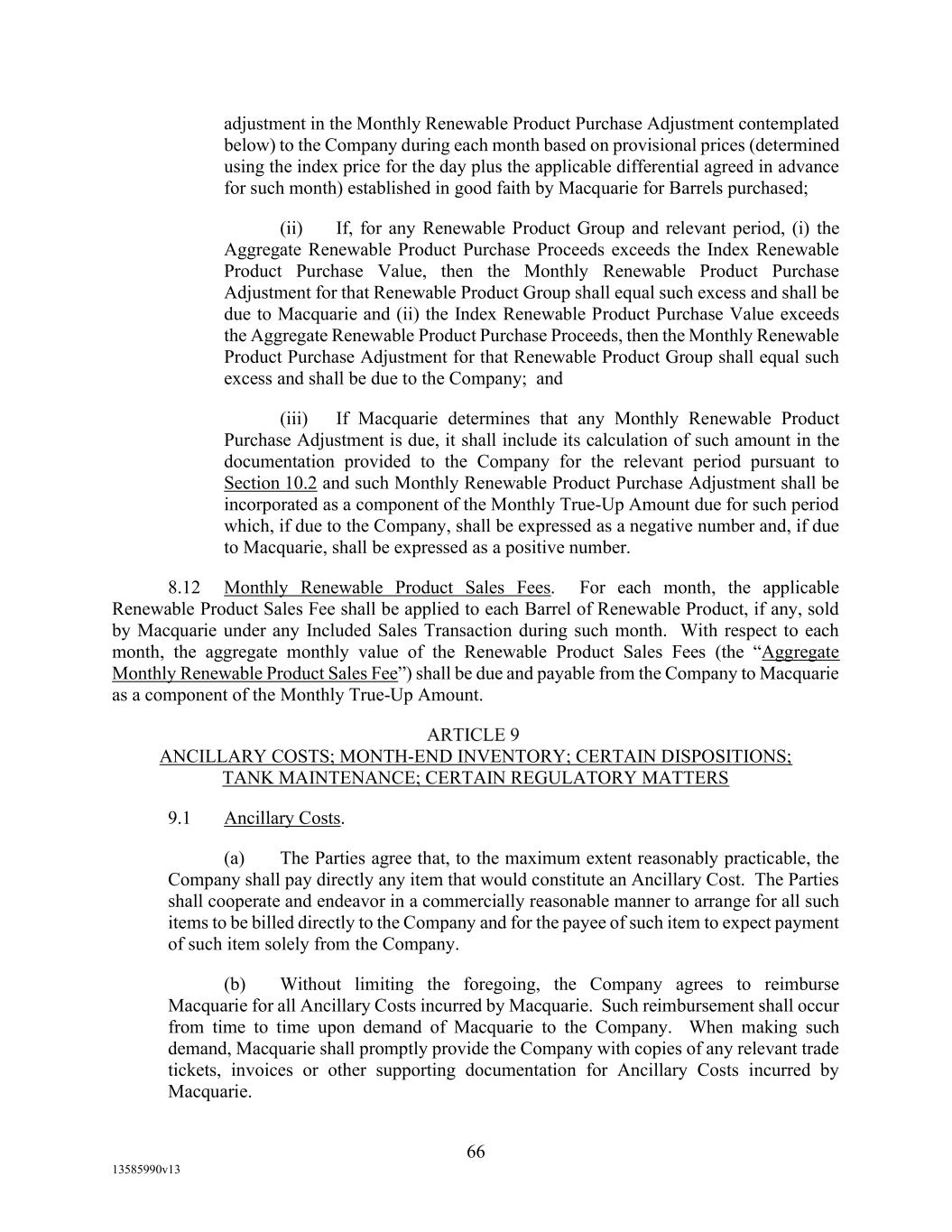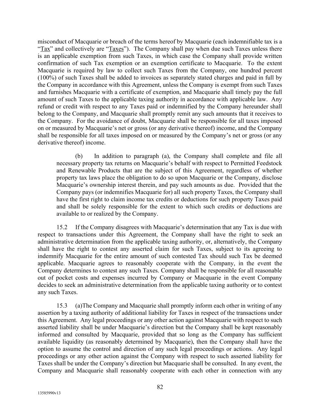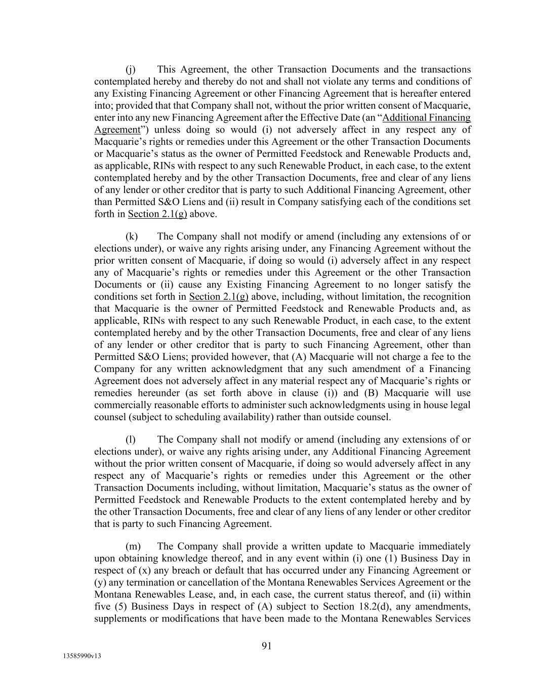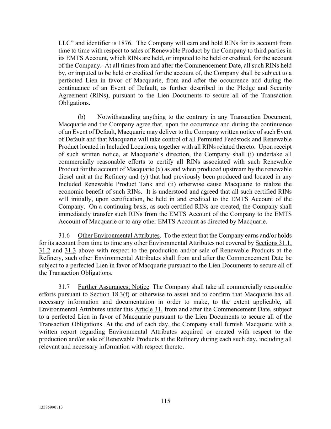 TABLE OF CONTENTS (continued) Page -iii- 4.29 Hedge Agreements ..................................................................................................... 89 5. AFFIRMATIVE COVENANTS. ................................................................................... 89 5.1 Financial Statements, Reports, Certificates ................................................................ 89 5.2 Reporting .................................................................................................................... 90 5.3 Existence .................................................................................................................... 90 5.4 Maintenance of Properties .......................................................................................... 90 5.5 Taxes .......................................................................................................................... 90 5.6 Insurance. ................................................................................................................... 90 5.7 Inspection. .................................................................................................................. 91 5.8 Compliance with Laws ............................................................................................... 92 5.9 Environmental ............................................................................................................ 92 5.10 Disclosure Updates ..................................................................................................... 92 5.11 Formation of Subsidiaries .......................................................................................... 92 5.12 Further Assurances ..................................................................................................... 93 5.13 [Reserved] .................................................................................................................. 93 5.14 Chief Executive Office ............................................................................................... 93 5.15 OFAC; Sanctions; Anti-Corruption Laws; Anti-Money Laundering Laws ............... 93 5.16 Blenders Tax Credits. ................................................................................................. 94 6. NEGATIVE COVENANTS. .......................................................................................... 94 6.1 Indebtedness ............................................................................................................... 94 6.2 Liens ........................................................................................................................... 94 6.3 Restrictions on Fundamental Changes ....................................................................... 94 6.4 Disposal of Assets ...................................................................................................... 95 6.5 Nature of Business...................................................................................................... 95 6.6 Prepayments and Amendments .................................................................................. 95 6.7 Restricted Payments ................................................................................................... 96 6.8 Accounting Methods .................................................................................................. 96 6.9 Investments ................................................................................................................. 96 6.10 Transactions with Affiliates ....................................................................................... 97 6.11 Use of Proceeds .......................................................................................................... 97