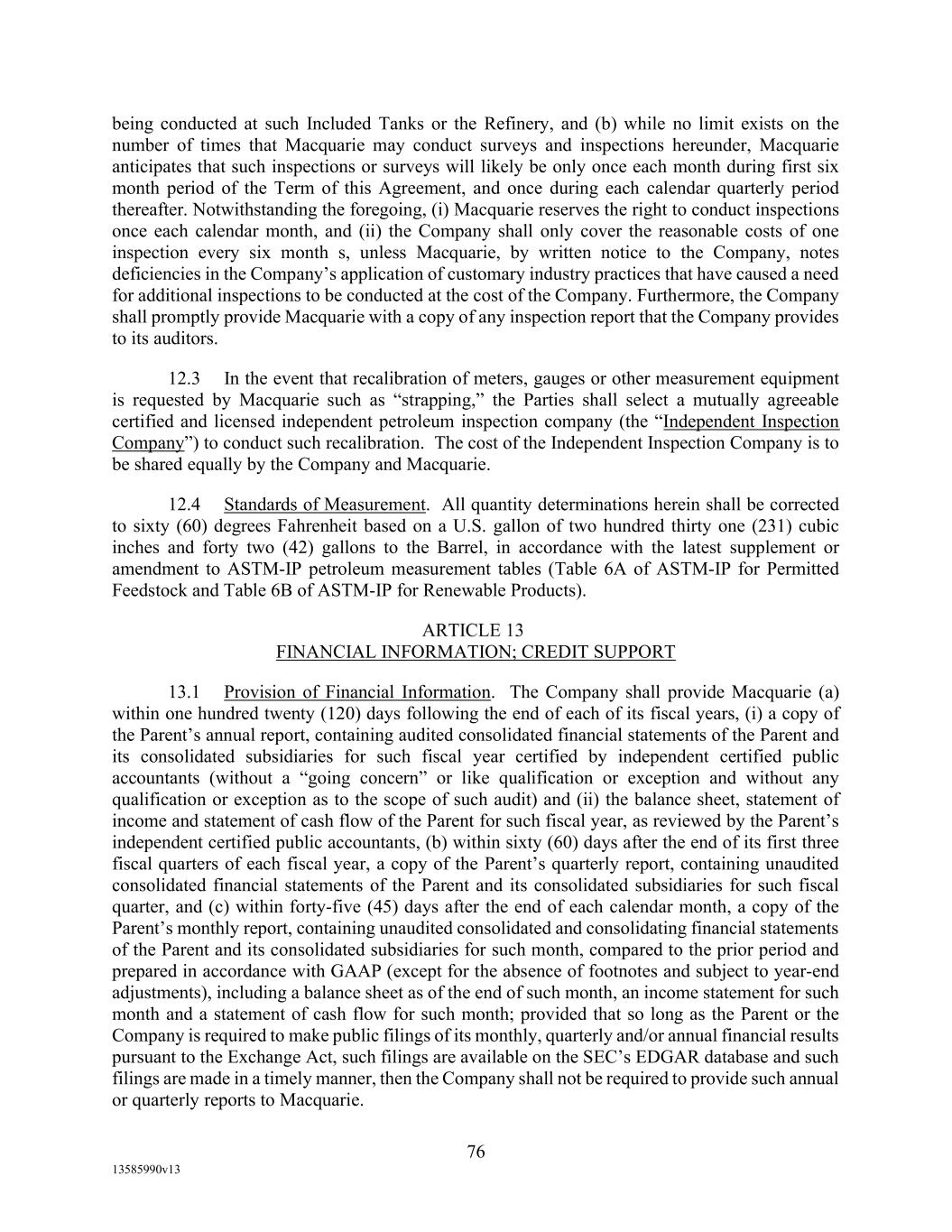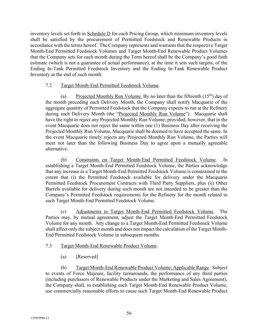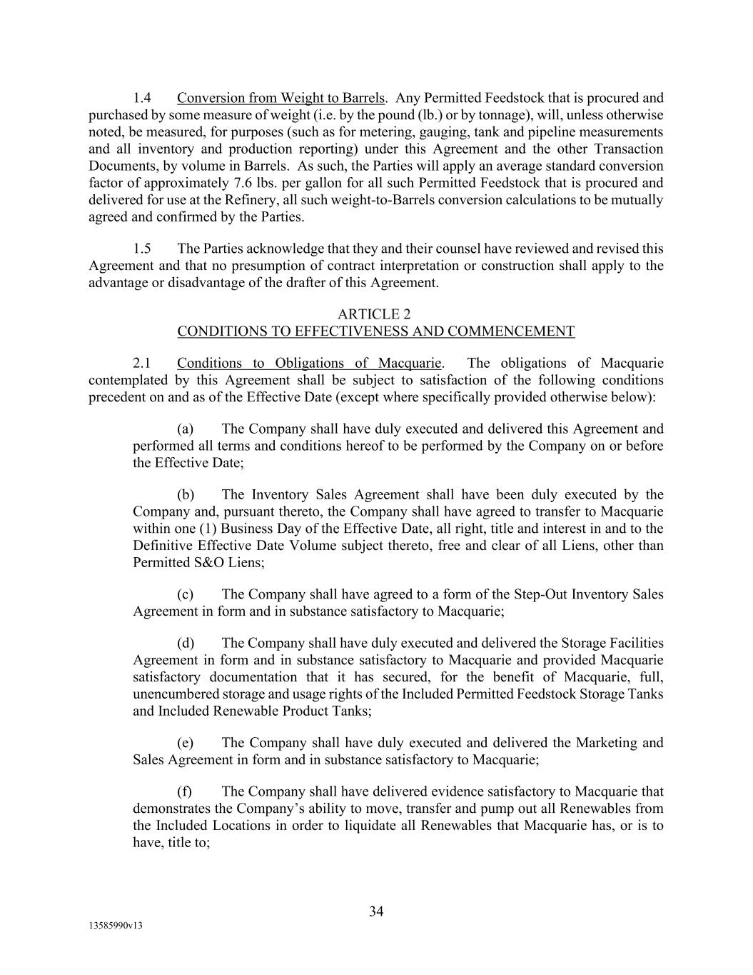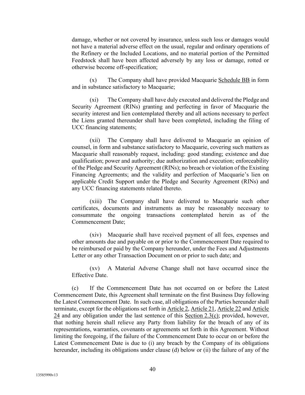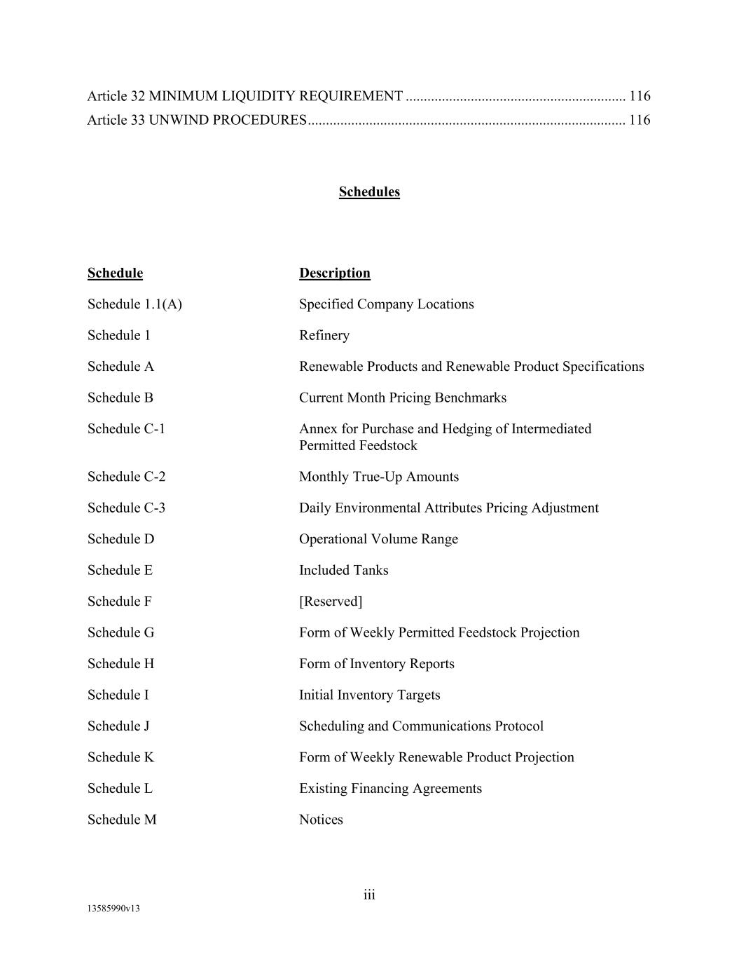 TABLE OF CONTENTS (continued) Page -iii- 4.29 Hedge Agreements ..................................................................................................... 89 5. AFFIRMATIVE COVENANTS. ................................................................................... 89 5.1 Financial Statements, Reports, Certificates ................................................................ 89 5.2 Reporting .................................................................................................................... 90 5.3 Existence .................................................................................................................... 90 5.4 Maintenance of Properties .......................................................................................... 90 5.5 Taxes .......................................................................................................................... 90 5.6 Insurance. ................................................................................................................... 90 5.7 Inspection. .................................................................................................................. 91 5.8 Compliance with Laws ............................................................................................... 92 5.9 Environmental ............................................................................................................ 92 5.10 Disclosure Updates ..................................................................................................... 92 5.11 Formation of Subsidiaries .......................................................................................... 92 5.12 Further Assurances ..................................................................................................... 93 5.13 [Reserved] .................................................................................................................. 93 5.14 Chief Executive Office ............................................................................................... 93 5.15 OFAC; Sanctions; Anti-Corruption Laws; Anti-Money Laundering Laws ............... 93 5.16 Blenders Tax Credits. ................................................................................................. 94 6. NEGATIVE COVENANTS. .......................................................................................... 94 6.1 Indebtedness ............................................................................................................... 94 6.2 Liens ........................................................................................................................... 94 6.3 Restrictions on Fundamental Changes ....................................................................... 94 6.4 Disposal of Assets ...................................................................................................... 95 6.5 Nature of Business...................................................................................................... 95 6.6 Prepayments and Amendments .................................................................................. 95 6.7 Restricted Payments ................................................................................................... 96 6.8 Accounting Methods .................................................................................................. 96 6.9 Investments ................................................................................................................. 96 6.10 Transactions with Affiliates ....................................................................................... 97 6.11 Use of Proceeds .......................................................................................................... 97