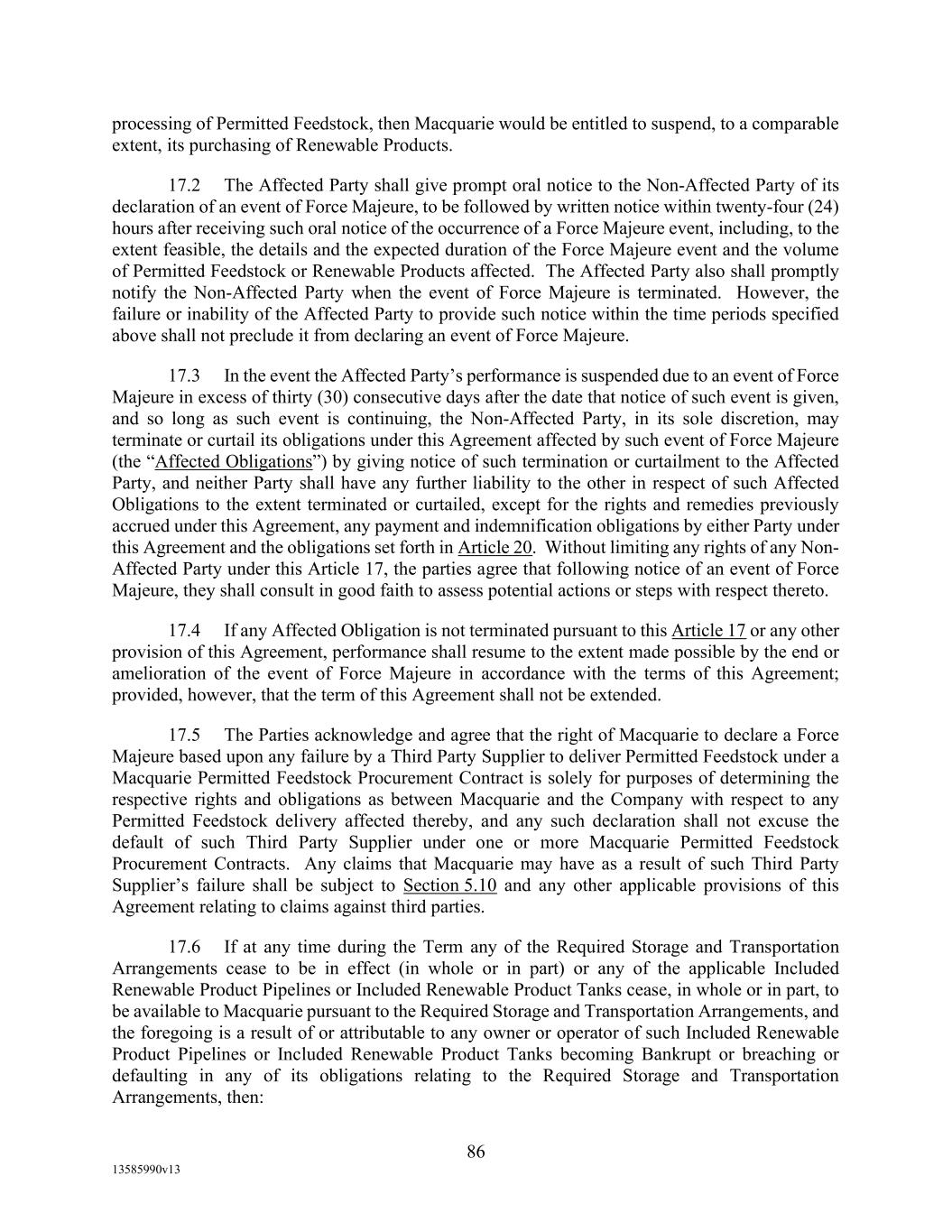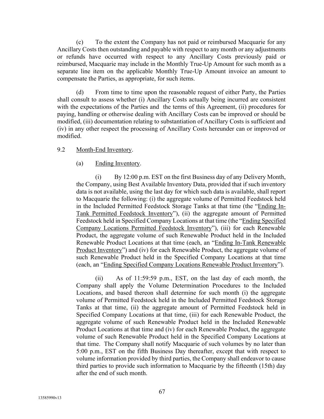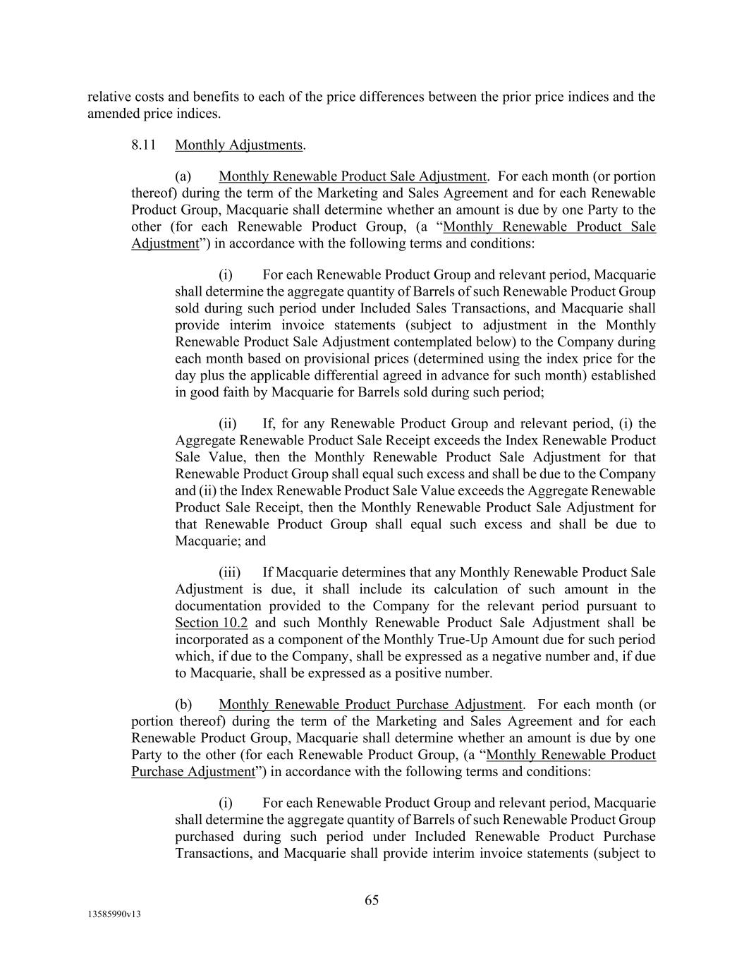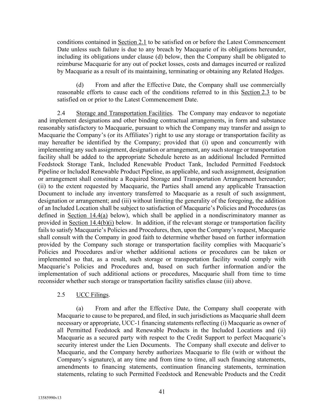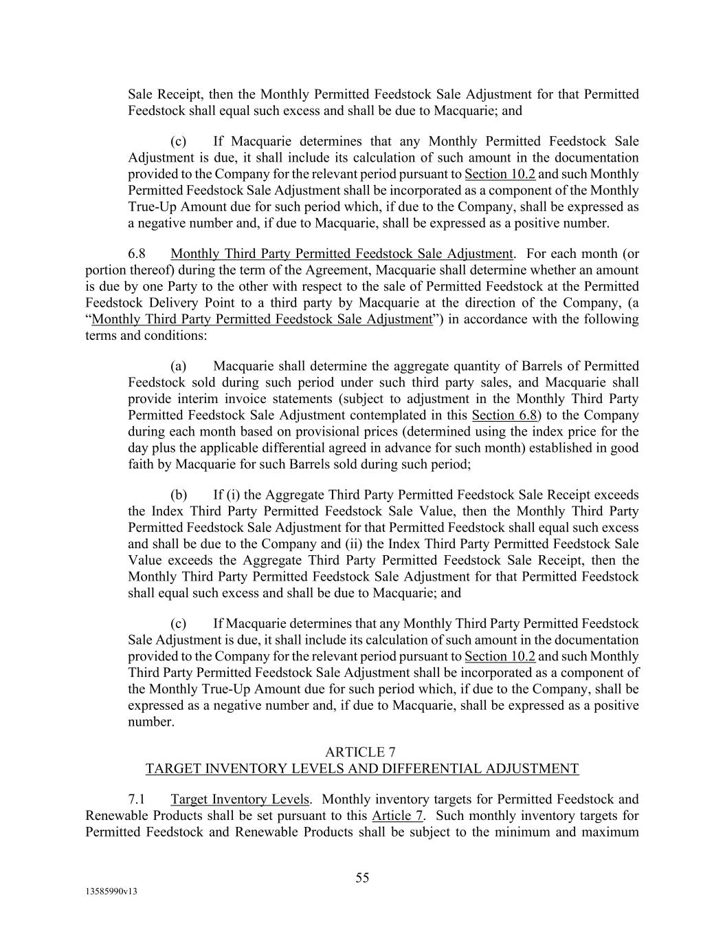 TABLE OF CONTENTS (continued) Page -iii- 4.29 Hedge Agreements ..................................................................................................... 89 5. AFFIRMATIVE COVENANTS. ................................................................................... 89 5.1 Financial Statements, Reports, Certificates ................................................................ 89 5.2 Reporting .................................................................................................................... 90 5.3 Existence .................................................................................................................... 90 5.4 Maintenance of Properties .......................................................................................... 90 5.5 Taxes .......................................................................................................................... 90 5.6 Insurance. ................................................................................................................... 90 5.7 Inspection. .................................................................................................................. 91 5.8 Compliance with Laws ............................................................................................... 92 5.9 Environmental ............................................................................................................ 92 5.10 Disclosure Updates ..................................................................................................... 92 5.11 Formation of Subsidiaries .......................................................................................... 92 5.12 Further Assurances ..................................................................................................... 93 5.13 [Reserved] .................................................................................................................. 93 5.14 Chief Executive Office ............................................................................................... 93 5.15 OFAC; Sanctions; Anti-Corruption Laws; Anti-Money Laundering Laws ............... 93 5.16 Blenders Tax Credits. ................................................................................................. 94 6. NEGATIVE COVENANTS. .......................................................................................... 94 6.1 Indebtedness ............................................................................................................... 94 6.2 Liens ........................................................................................................................... 94 6.3 Restrictions on Fundamental Changes ....................................................................... 94 6.4 Disposal of Assets ...................................................................................................... 95 6.5 Nature of Business...................................................................................................... 95 6.6 Prepayments and Amendments .................................................................................. 95 6.7 Restricted Payments ................................................................................................... 96 6.8 Accounting Methods .................................................................................................. 96 6.9 Investments ................................................................................................................. 96 6.10 Transactions with Affiliates ....................................................................................... 97 6.11 Use of Proceeds .......................................................................................................... 97